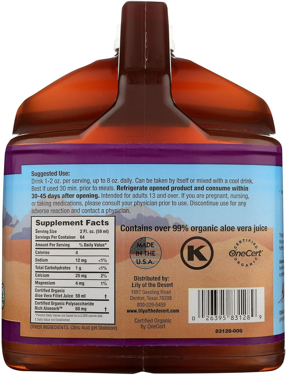 Tipo de dieta USDA OrganicVegano Lily of the Desert ha sido un productor líder de Aloe Vera desde 1971. Los productos de jugo y gel están hechos con hojas orgánicas certificadas que se cultivan en el fértil Valle del Río Grande de Texas. el mayor produc procesador y distribuidor orgánico certificado de productos de aloe v trabajamos arduamente para brindar a nuestro s el aloe más puro del mercado. Al mantener el control del proceso to la gerencia de Lilly pued que sus productos cumplan o superen los estándares más altos de la industria.