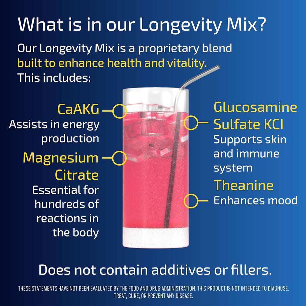 Acerca de este art MEZCLA DE INGREDIENTES PROPRIETARIOS: Nuestra mezcla de longevidad es una binación exclusiva diseñada para mejorar la salud. Importa estás obteniendo dosis a nivel de ensayo clínico en cada porción. Con solo una cucharada a puedes decir adiós a la molestia de tragar innumerables suplementos y a las empresas que ofrecen niveles ineficaces de ingredientes. Formulada con una meti sa selección de ingredientes podero esta bebida revolucionaria es todo lo que tu cuerpo necesita en un solo lugar. INGREDIENTES DE ALTA CALIDAD: Ca Ashwagandha KS Monohidrato de Creat Glic L-Tean Glutatión reduc Ácido Hialurónico de So Vitamina C (Ácido Ascórbi Lis Taur Citrato de Calcio y Magne cada sorbo de Longevity Mix ofrece una dosis potente de nutrientes esenciales que tu cuerpo anhela. PROMUEVE UNA VIDA MÁS SALUDABLE: Nuestra mezcla está diseñada para apoyar los mayores desafíos de la v o promover un sueño más profu mejorar la recuperación muscular y aumentar la concentración. MEJORA EL ESTADO DE ÁNIMO: Ingredientes clave o la L-Tean Ashwagandha y CaAKG mejoran la producción de energía y promueven el bienestar general. PARA TODOS: Nuestro Longevity Mix es No- Vegano y Sin Lácteos. También es patible con la dieta Keto y Paleo. ? Ver más detalles del producto DESCRIPCIÓN DEL PRODUCTO: MEZCLA EXCLUSIVA: Nuestra mezcla de longevidad es una fórmula exclusiva diseñada para mejorar la salud. Con dosis a nivel de ensayos clínicos en cada porc con solo una cucharada a puedes decir adiós a la molestia de tragar innumerables suplementos. Formulada con una cuidadosa selección de ingredientes poten esta bebida revolucionaria es todo lo que tu cuerpo necesita en un solo lugar. INGREDIENTES DE ALTA CALIDAD: Ca Ashwagandha KS Creatina Monohidrat Glic L-Tean Glutatión reduc Hialuronato de So Vitamina C (Ácido Ascórbi Lis Taur Calcio y Citrato de Magne cada sorbo de Longevity Mix proporciona una dosis potente de nutrientes esenciales que tu cuerpo necesita. PROMUEVE UNA VIDA MÁS SALUDABLE: Nuestra mezcla está diseñada para apoyar los mayores desafíos de la v o promover un sueño más profu mejorar la recuperación muscular y aumentar la concentración. MEJORA EL ESTADO DE ÁNIMO: Ingredientes clave o L-Tean Ashwagandha y CaAKG aumentan la producción de energía y promueven el bienestar general. PARA TODOS: Nuestro Longevity Mix es libre d vegano y sin lácteos. También es patible con las dietas Keto y Paleo.