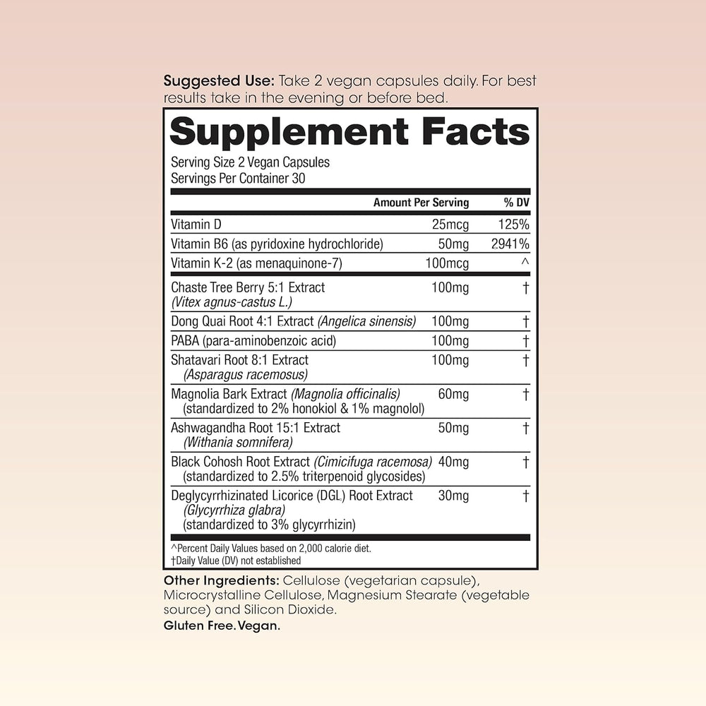 Forma del producto Cápsula Winged Wellness Característica del material Sin glu Sin láct Sin Azú Vegano Número de artículos 1 Recuento de unidades 30.00 Count Equilibrio hormonal: Estos suplementos menopáusicos veganos contienen una mezcla de hierbas y suplementos que trabajan juntos para apoyar el equilibrio hormonal y aliviar los síntomas asociados con la menopausia. Ingredientes naturales: los suplementos de alivio de la menopausia Winged Wellness están hechos con ingredientes natura incluyendo cohosh ne extracto de soja y raíz de dong q para proporcionar un alivio suave y eficaz sin el uso d sintéticas. Promueve la salud ósea: estas cápsulas de equilibrio hormonal también contienen calcio y vitamina D para apoyar la salud ó lo que puede ser especialmente importante durante la menopausia cuando las mujeres tienen un mayo de osteoporosis. Fácil de tomar: Nuestras vitaminas para la menopausia son fáciles de tomar y de añadir a su rutina diaria. Winged Wellness r enda tomar una dosis de 2 cápsulas por día. Para obtener los mejores resulta tómelo por la noche o antes de acostarse.