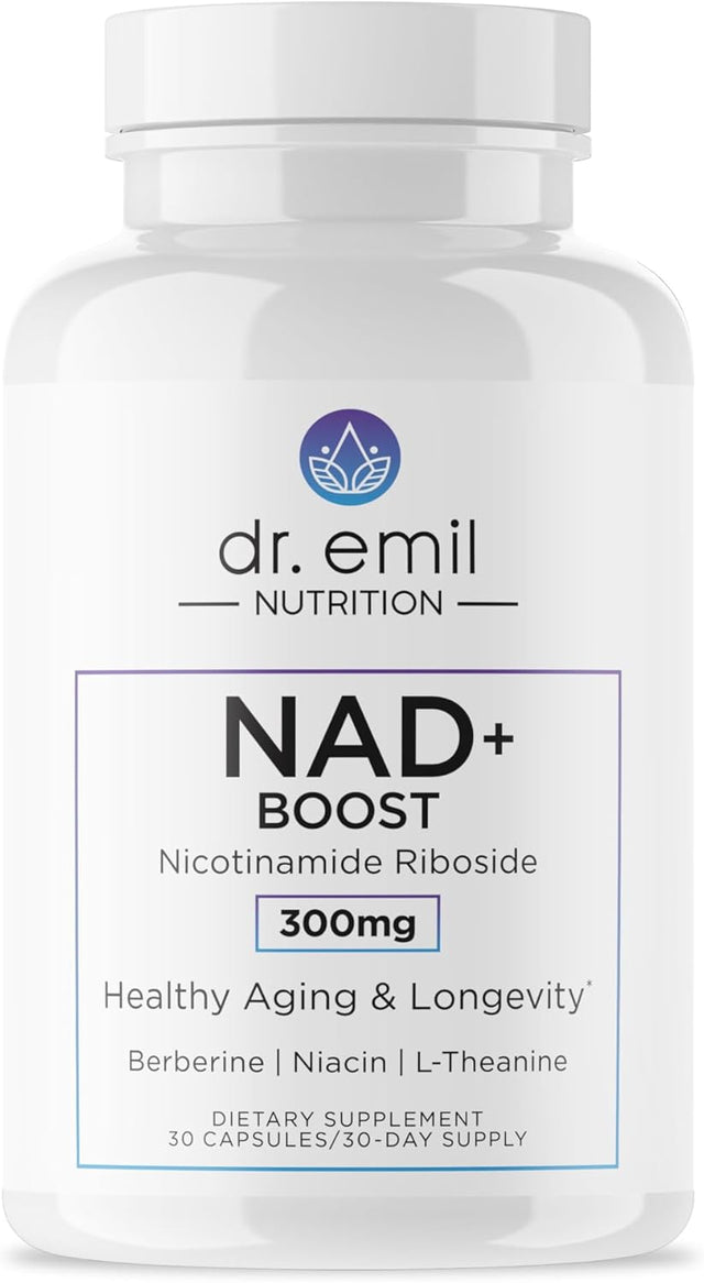 NUTRICION DR EMIL Sabor Nutrición NAD+ Boost Tipo de suplemento primario NAD+ apoya los efectos antienvejecimiento debido a su papel en el apoyo a los procesos celulares. Recuento de unidades 30.00 Cuenta Forma del producto Cápsula Beneficios del producto Antienvejecimiento Rango de edad (descripción) Adulto Información del empaque Frasco Número de artículos 1 Porciones por Envase 60 Combata el envejecimiento desde dentro: este suplemento NAD potencia las defensas naturales de su cuerpo contra los efectos del envejecimiento al apoyar la salud celu lo que puede conducir a una persona más joven y enérgica. Revitalice la salud celular: 300 mg de nicotinamida ribós un potente precursor de N apoya la producción de energía celular y la reparación del ADN. Mezcla de ingredientes funcionales: repleto de ingredientes lementar incluidos 150 mg de berber 100 mg de L-tean niacina y co este poderoso suplemento contra el envejecimiento está cuidadosamente elaborado para mejorar su bienestar general y promover la longevidad. Formulación derivada de un médico: el Dr. Emil revisó la investigación y utilizó su experiencia tanto en suplementación en ciencia para identificar el poder de NAD. El camino hacia un envejecimiento saludable y una longevidad puede parecer abruma pero creemos que no tiene por qué ser licado.