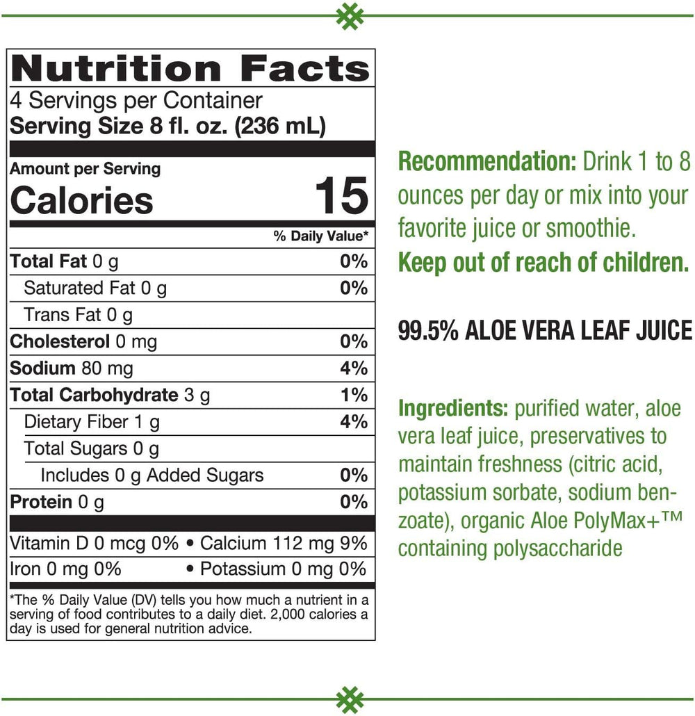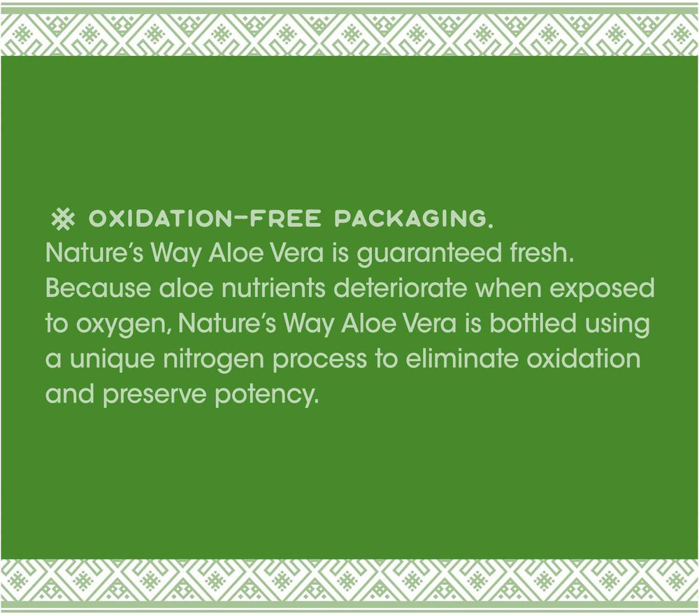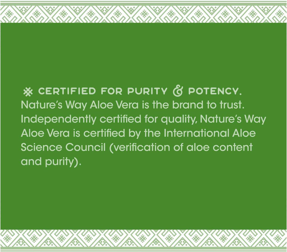 Nature Way El aloe vera está mejorado con aloe PolyMax (un polisacárido de aloe patentado). Jugo de aloe vera purificado al 99, de concentr vegetari sin gluten Este producto contiene aloe vera cultivado orgánicamente que se cosecha en el pico de potencia nutritiva y aloe recién procesado en frío. Nature Way El aloe vera está garantizado fresco. Utilizamos un proceso único de nitrógeno que elimina la oxidación y conserva nuestra potencia. Nuestro Aloe Vera está certificado de forma independiente tanto por el Consejo Internacional de Ciencias de Aloe (verificación del contenido de aloe y pureza).