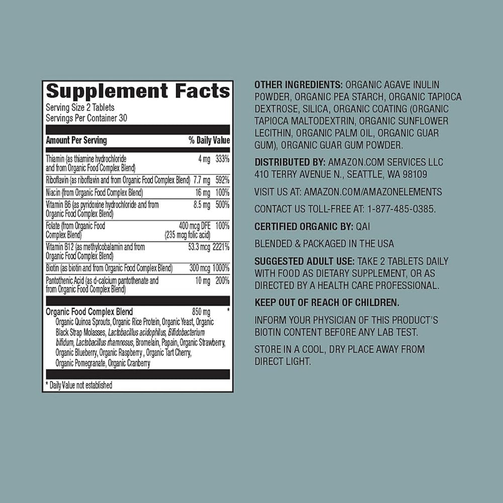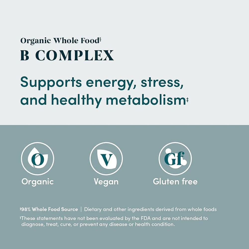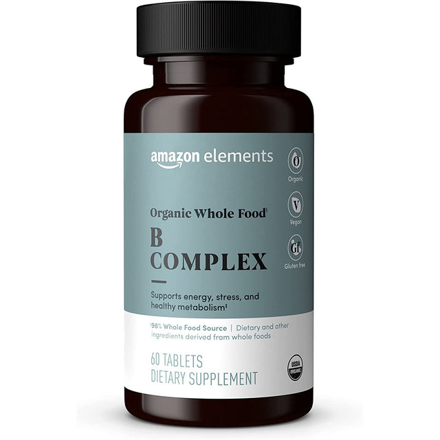 Complejo orgánico de alimentos enteros B Complex, suplemento dietético, 60 comprimidos 98% de fuente de alimentos integrales; dietética y otros ingredientes derivados de alimentos enteros Apoya la energía, el estrés y el metabolismo saludable Certificado orgánico USDA, ingredientes sin OMG, certificado vegano y sin gluten Mezclado y empaquetado en Estados Unidos Si te gusta el complejo B de Garden of Life mykind Organics, te invitamos a probar el complejo B de alimentos integrales orgánicos de Amazon Elements.