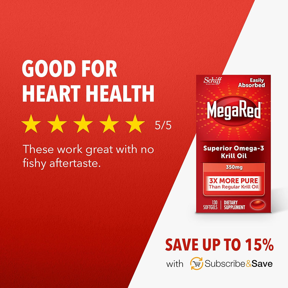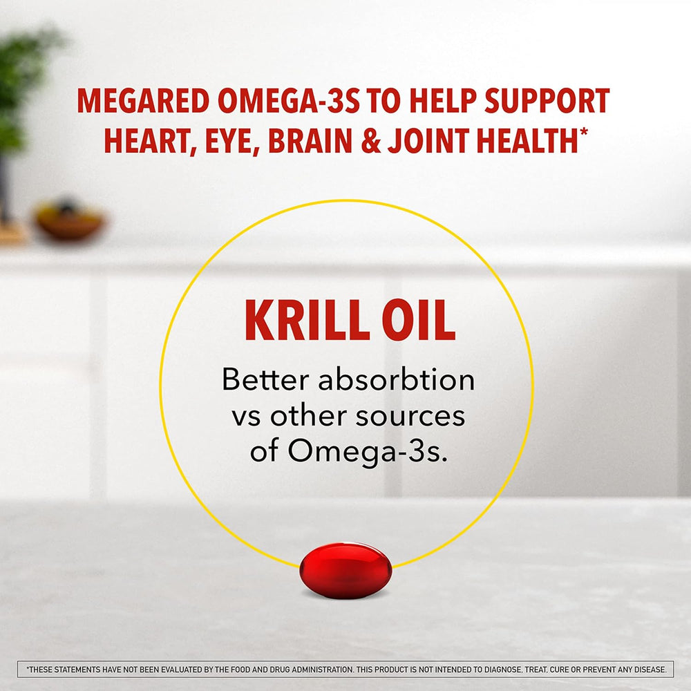 Una cápsula diaria fácil de tragar proporciona 0.01oz de aceite de krill 100% antártico. Contiene ácidos grasos omega 3 que pueden reducir el riesgo de enfermedades coronarias. El aceite de krill de MegaRed se transporta mediante fosfolípidos por lo que es de fácil absorción. A diferencia del aceite de pescado, el aceite de krill no tiene olor a pescado y no deja sabor en la boca. Contiene astaxantina que proporciona carotenoide y beneficios antioxidantes.