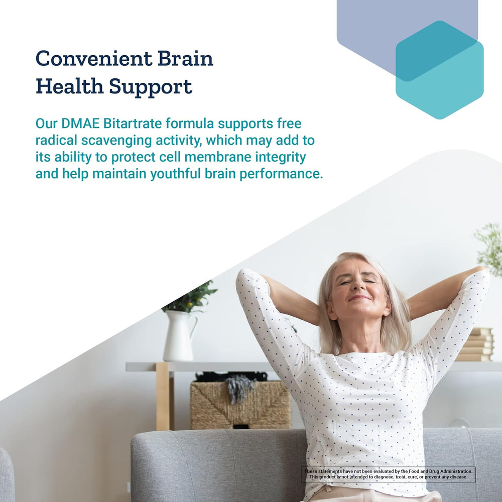 Soporte de memoria y aprendizaje: DMAE (2-dimetilaminoetanol) se utiliza en el cuerpo para hacer colina, un compuesto esencial necesario para la producción óptima de acetilcolina, el principal neurotransmisor involucrado en la memoria y el aprendizaje. Nuestra fórmula para el cerebro ofrece 150 mg de DMAE para apoyar la producción del cuerpo de este neurotransmisor esencial. Protege tus células: las células sanas tienen membranas celulares saludables, que son cruciales para cada estructura y función de tu cuerpo. DMAE ayuda a proteger las membranas celulares apoyando la producción de grasas esenciales (fosfatidilcolina) que se utilizan en la construcción y rejuvenecimiento de membranas celulares. Práctico apoyo para la salud cerebral: nuestra fórmula de bitartrato DMAE apoya la actividad de eliminación de radicales libres, lo que puede aumentar su capacidad para proteger la integridad de la membrana celular y ayudar a mantener el rendimiento cerebral juvenil. Los ingredientes importan: se obtiene utilizando solo los mejores ingredientes crudos con la pureza y potencia que tu cuerpo merece. Este producto está certificado sin OMG y sin gluten. Fabricado en los Estados Unidos y un certificado de análisis está disponible para cada producto que producimos. Vive tu vida más saludable: durante más de 40 años, hemos estado desarrollando fórmulas avanzadas y eficaces hechas con los más altos estándares y basadas en los últimos hallazgos científicos. Creemos que las respuestas a una vida más saludable y rica están al alcance y que la rigurosa investigación científica es el camino para llevarnos allí. Nuestras formulaciones se crean utilizando los ingredientes exactos y dosis utilizados en los estudios que los inspiraron, asegurando que se logre la máxima biodisponibilidad y eficacia.