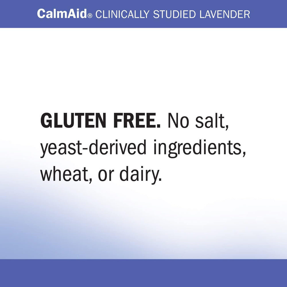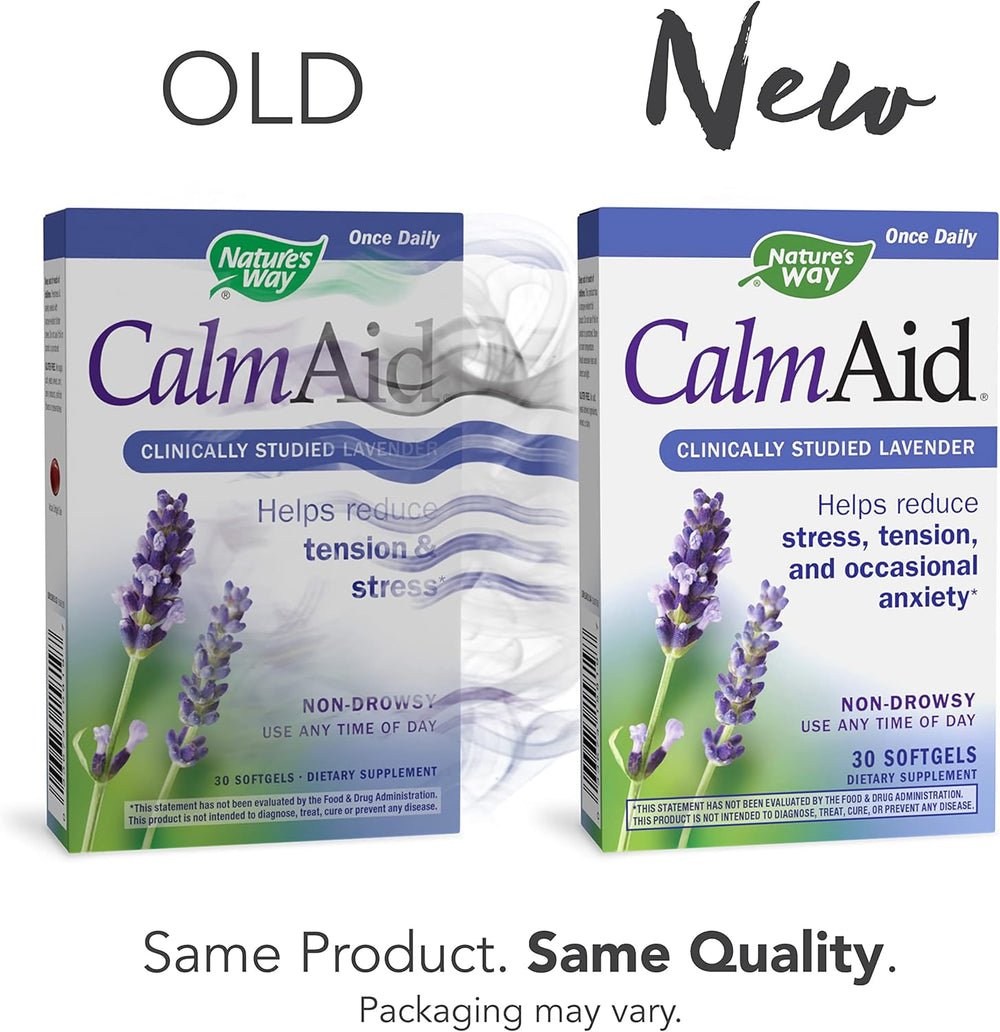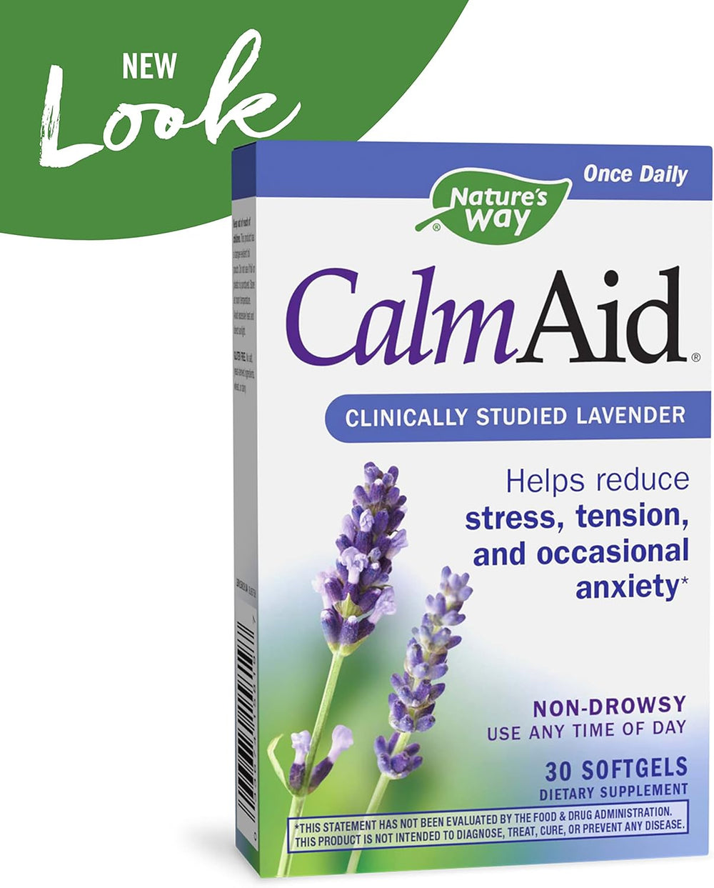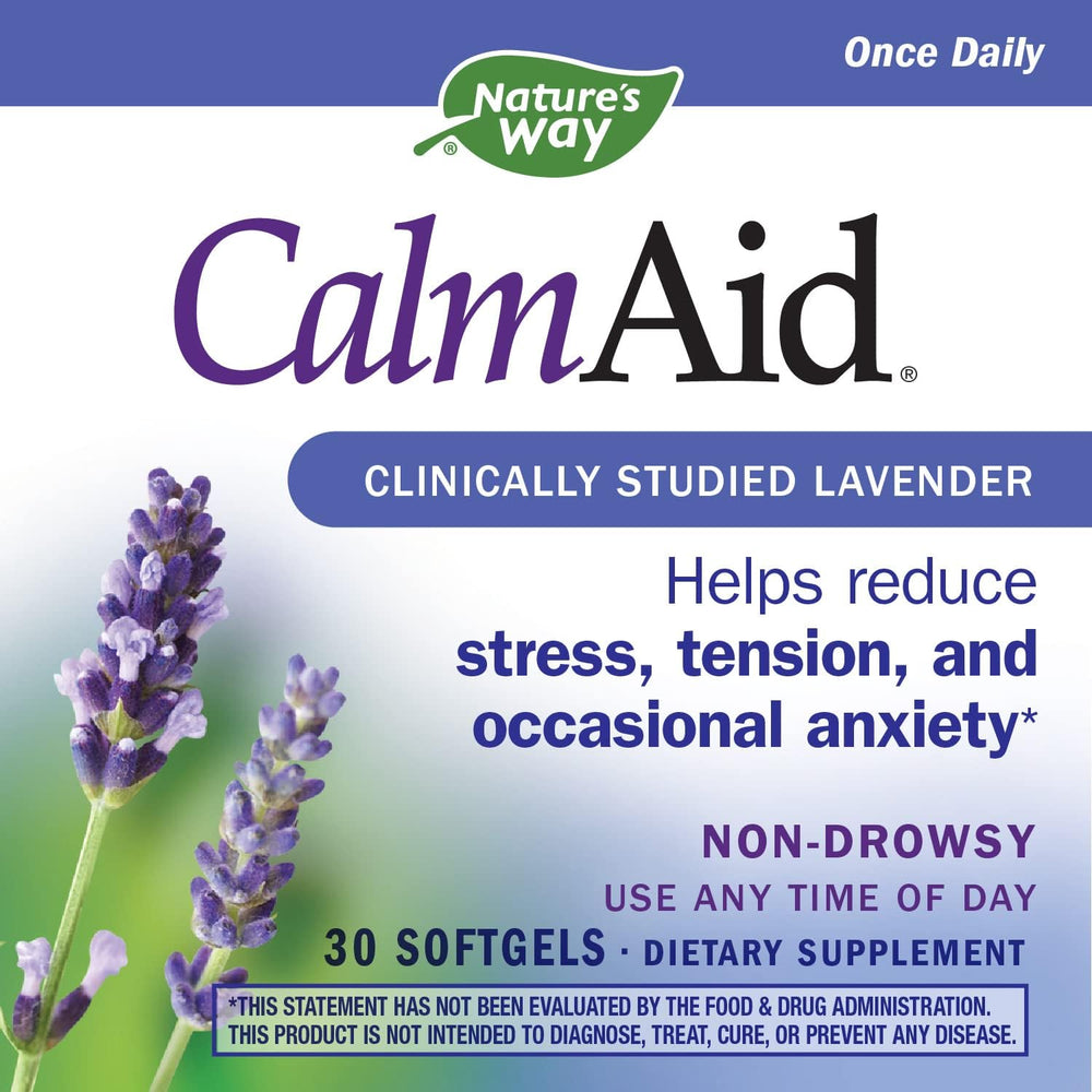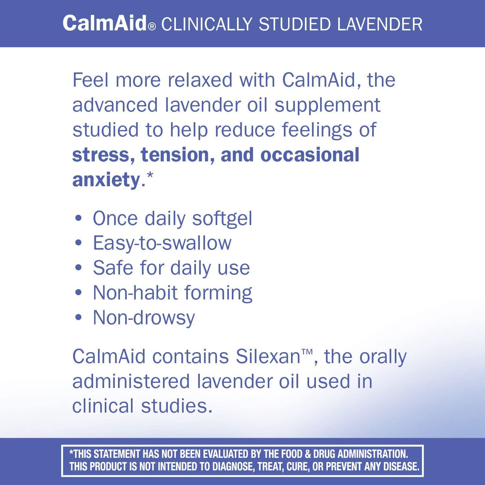 La lavanda clínicamente estudiada ayuda a reducir la tensión y el estrés.* CalmAid está hecho con Sile un aceite de lavanda clínicamente estudi para reducir la sensación de tensión y estrés ocasional.* Los adultos toman 1 cápsula blanda una o dos veces al día con a fácil de tragar y segura para el uso diario. CalmAid es seguro para usar en cualquier momento del día y no lo hará sentir somnoliento. Hecho con ingredientes saludables: las cápsulas blandas no contienen gluten y no contiene ingredientes derivados de levad trigo ni lácteos.
