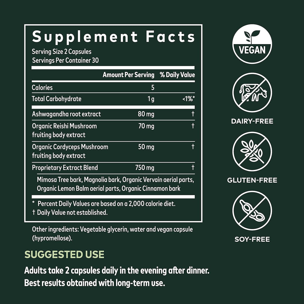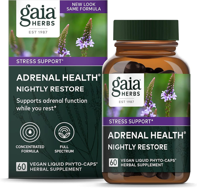 [El embalaje puede variar] Incluye 1 (60 unidades) Gaia Herbs suprrenal Health Nightly Restore – suplemento de hierbas a base de plantas Sujeción suave y calmante para una noche tranquila: Adrenal Health Nightly Restore contiene adaptógenos regulado restauradores y calmantes (pero no sed Ashwagan Magnolia y mim todos los cuales ayudan a relajar y calmar el cuerpo y promover un ciclo de sueño saludable. Ashwagandha ayuda a promover patrones normales de sueño y apoya los sistemas endocrinos e inmunológicos saludables. La corteza de magnolia calma el nerviosismo ocasional y ayuda al sueño. Otros botánicos el bálsamo de limón muestran promesas en estudios de investigación para promover una sensación de calma en el cuerpo. Ingredientes orgánicos y ecológicamente cosechados: fabricado con Rei Cordyc bálsamo de limón y Vervain; y con cosechado ecológicame de origen responsa Ashwagan corteza de mimosa y corteza de magnolia. Más allá de la transparencia: Gaia Herbs pionero en suplemento de hierbas transparencia y trazabilidad. El número único de identificación de Meet Your Herbs en cada producto que hacemos te permite realizar una robación de fondo en tu suplemento de hierbas Gaia. Simplemente introduce el número de identificación de conocer tus hierbas en tu botella para descubrir de dónde provienen las hierbas de tu produ cómo se cultivaron y ver la validación de la pur integridad y potencia de tu producto. Validamos en cada etapa del viaje de semillas a esta porque mereces saber exactamente lo que hay en cada producto que pones en tu cuerpo... y lo que no es.
