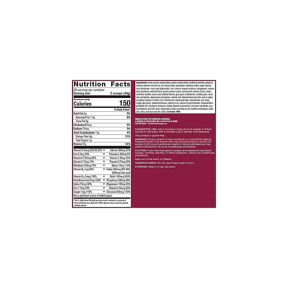 Ingredientes Calorías Proteína Carbohidratos Fibra Azúcares Grasa Saturada Vitamina A Vitamina D Vitamina E Vitamina K Vitamina C B1 B2 B6 B12 Niacin Ácido Pantoténico Ácido Fólico Calcio Cobre Yodino Hierro Magnesio Fósforo Zinc Potasio Sodio Selenio Manganeso Molibdeno Sobre este artículo Bariatric Advantage Sabor Fresa Peso 1232 Gramos Forma del artículo Peso del paquete 1.27 Kilogramos Información del empaque Bolsa Rango de edad (descripción) Adulto Número de artículos 1 Recuento de unidades 1.00 Count Cada porción de 150 a 160 calorías proporciona 0.95 oz de prote con solo 0.25 oz de carbohidratos y 0.05 oz de grasa Sin lactosa para apoyar mejor a aquellos que tiene con la digestión del azúcar de leche Fortificado con entre el 15 y el 50 del DV para 23 vitaminas y minerales esenciales Viene en una bolsa económica de 35 porciones con una cuchara medida para facilitar la dispensación precisa