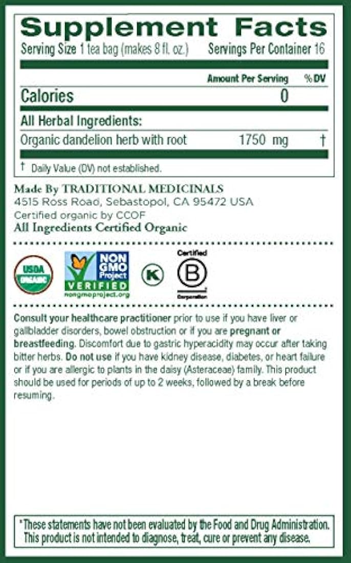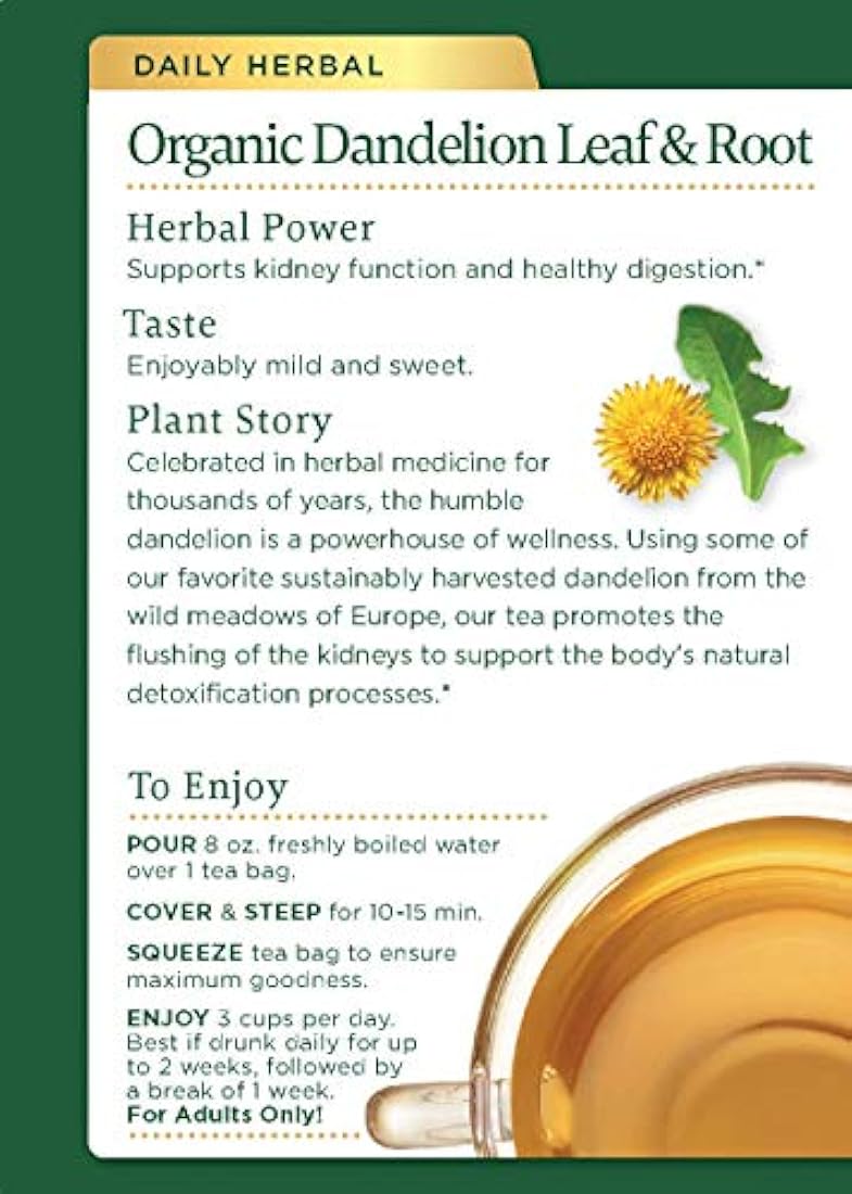 *** Características *** Soporta función renal y digestión saludable. No OMG verificado. Todos los ingredientes certificados orgánicos. Comestible según la ley judía. Sin cafeína. Hierbas de alta calidad consistente de asociaciones erciales éticas. Sabor: deliciosamente suave y dulce. Caja de tres cajas, cada caja contiene 16 bolsas de té selladas. Potencia herbal, Apoya la función renal y la digestión saludable Sabor, agradable y dulce. Historia de la planta: Celebrado en medicina herbal durante millas de años, el humilde diente de león es una potencia del bienestar. Utilizando algunos de nuestros dientes de león cosechado sosteniblemente de las praderas salvajes de Europa, nuestro té promueve el enjuague de los riñones para apoyar los procesos naturales de desintoxicación del cuerpo.