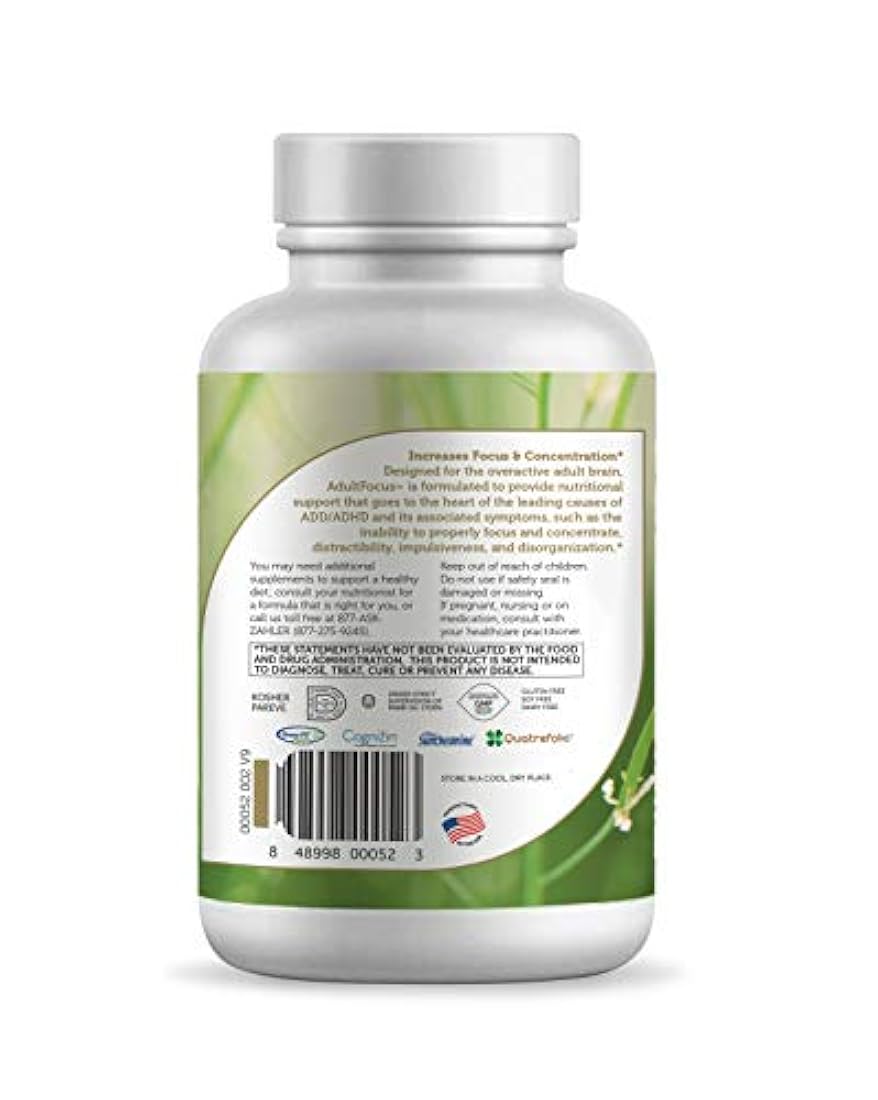 *** Características *** Acerca: Zahler AdultFocus es una fórmula avanzada para mejorar el enfoque y la concentración. Beneficios: Adulto Focus está diseñado para el cerebro adulto sobreactivo y proporciona apoyo nutricional que va al calor de las principales causas de ADD / ADHD SISTEMAS: AdulFocus está formulado para síntomas o la incapacidad de concentración y concentración de síntomas, distractibilidad, impulsión y desorganización Ingredientes: contiene potentes ingredientes o Suntheanine, Vitaminas B, Cognizin y promueve la diversión cognitiva. Fabricado en los Estados Unidos: fabricado y embotellado en los Estados Unidos en una instalación de última generación con certificación GMP. Acerca: Zahler AdultFocus es una fórmula avanzada para mejorar el enfoque y la concentración. Beneficios: Adulto Focus está diseñado para el cerebro adulto sobreactivo y proporciona apoyo nutricional que va al calor de las principales causas de ADD / ADHD SISTEMAS: AdulFocus está formulado para síntomas o la incapacidad de concentración y concentración de síntomas, distractibilidad, impulsión y desorganización Ingredientes: contiene potentes ingredientes o Suntheanine, Vitaminas B, Cognizin y promueve la diversión cognitiva. Fabricado en los Estados Unidos: fabricado y embotellado en los Estados Unidos en una instalación de última generación con certificación GMP.