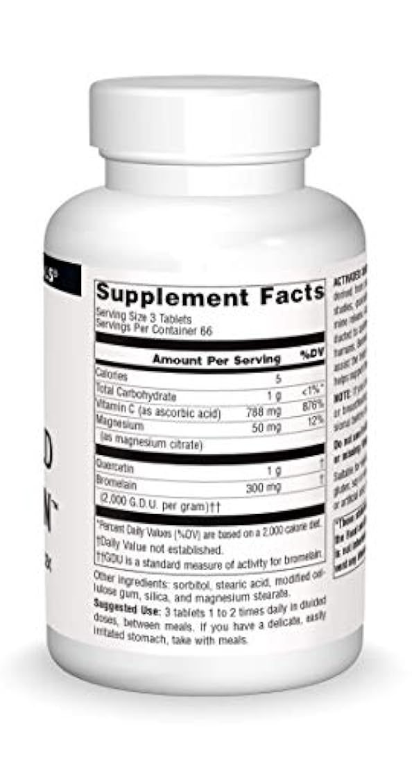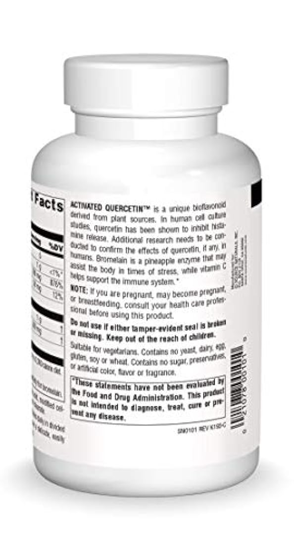 *** Características *** APOYO ESTACIONAL: suplemento de apoyo estacional con quercetina, un bloqueador natural de la histamina, que ayuda a inhibir la liberación de histamina, junto con ingredientes adicionales clave para el apoyo inmunológico. Este producto contiene bromelina, que se ha demostrado en estudios preliminares para apoyar una respuesta inflamatoria saludable. También contiene quercetina activada también contiene vitamina C, que apoya la salud inmunológica. ORIGINAL: El ingrediente principal de la quercetina activada, la quercetina, es un bioflavonoide único derivado de fuentes vegetales que se ha demostrado en estudios de cultivos celulares humanos que inhibe la liberación de histamina. USO SUGERIDO Y ADECUADO PARA VEGETARIOS. 3 cápsulas 1 a 2 veces al día en dosis divididas, entre idas. Si tiene un estómago delicado y fácilmente irritable, tómelo con las idas. No contiene levadura, lácteos, huevos, gluten, soja o trigo. No contiene azúcar, sal, conservantes ni colorantes, sabores o fragancias artificiales. CONFIANZA POR MÁS DE 35 AÑOS. Source Naturals fue creado en 1982 por el CEO Ira Goldberg para apoyar el potencial de cada individuo para disfrutar de una salud óptima. FABRICADO EN LOS ESTADOS UNIDOS. Nuestras instalaciones están ubicadas en Scotts Valley California. La quercetina activada es un bioflavonoide único derivado de fuentes vegetales. En estudios de cultivo de células humanas, se ha demostrado que la quercetina inhibe la liberación de histamina. Se necesita realizar investigación adicional para confirmar los efectos de la quercetina, si los hay, en humanos. La bromelina es una enzima de piña que puede ayudar al cuerpo en momentos de estrés, mientras que la vitamina C ayuda al sistema inmunológico. 3 cápsulas 1 a 2 veces al día en dosis divididas, entre idas. Si tiene un estómago delicado y fácilmente irritable, tómelo con las idas. Póngase en contacto con nuestro servicio de atención al cliente interno si tiene alguna pregunta.