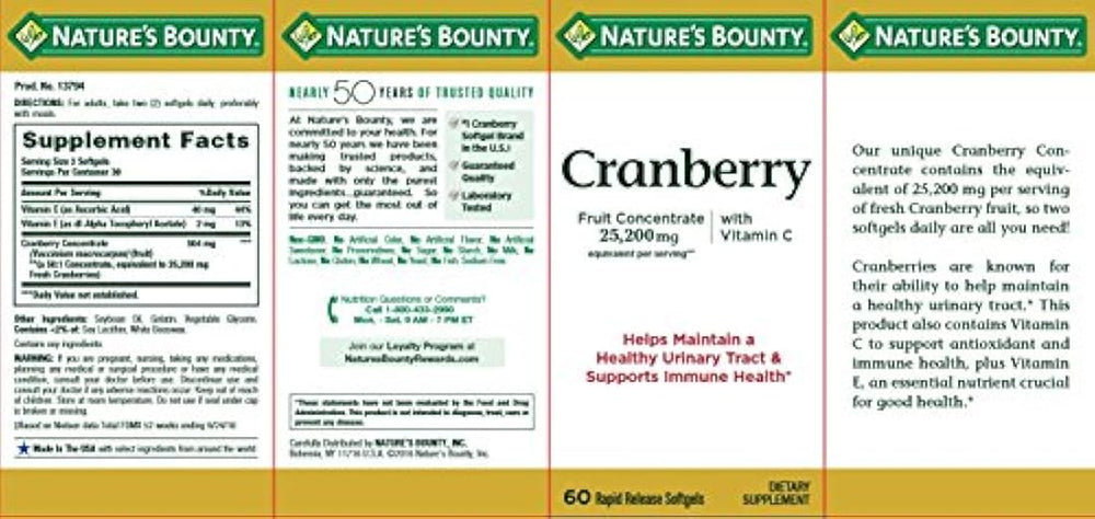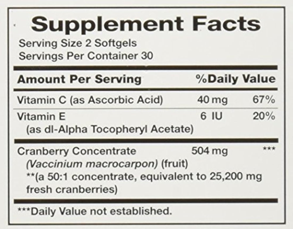 *** Características *** Apoya la salud del tracto urinario * Ayuda a mantener la integridad de la vejiga * Mejorado con el apoyo inmune de la vitamina C y antioxidantes de la vitamina E * Píldoras de gel fácil de tomar * Estas declaraciones no han sido evaluadas por la Administración de Alimentos y Medicamentos Este producto no está destinado a diagnosticar, tratar, curar o prevenir ninguna enfermedad. Los arándanos ayudan a mantener la integridad de las paredes de la vejiga para promover la salud urinaria tanto en hombres o en mujeres. * Este producto también contiene vitamina C que desempeña un papel en el apoyo de la función inmune. * Hecho del mejor concentrado de arándano disponible.