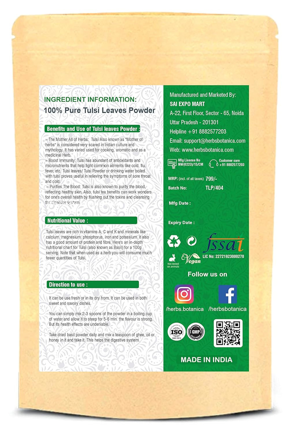 Sobre este artículo Tulsi orgánico puro para el bienestar natural Rico en antioxidantes para aumentar la inmunidad Apoya el alivio del estrés y la relajación Promueve la digestión y el metabolismo saludables plemento conveniente y versátil para bebidas y recetas Tulsi es rico en vitamina C y zinc. Por lo ta actúa o un refuerzo natural de la inmunidad. Tulsi o albahaca sagrada es una hierba ampliamente conocida en la familia Lamiaceae. Es originaria de la India y se cultiva ampliamente en todo el sudeste asiático. Tulsi tiene un lugar especial en Ayurv así o el hogar de los hindúes en la India. Es considerado sagrado por los hindúes y adorado por ellos. Tres tipos principales de Tulsi se ven creciendo en la India: - Hojas de color verde brillant das Ram Tulsi - Hojas de color verde púrpur das Krishna Tulsi - Vana Tulsi