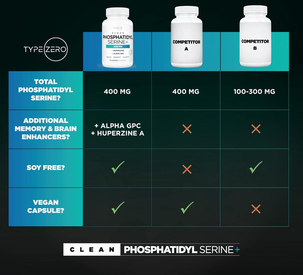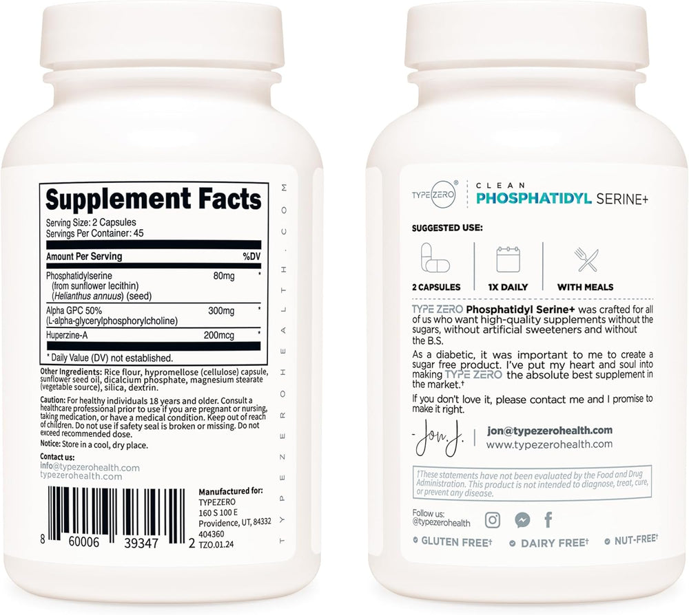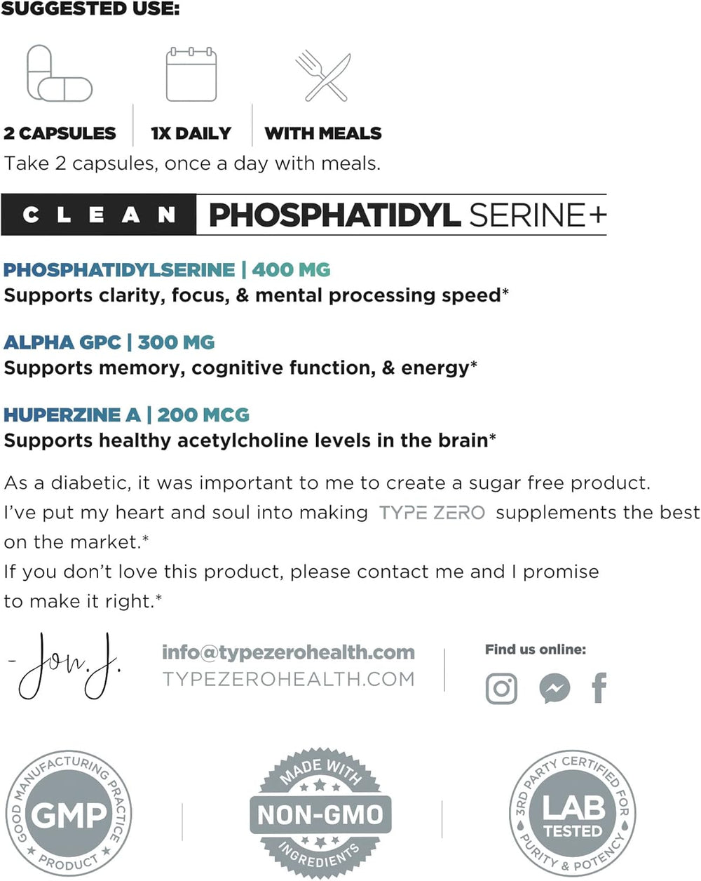 About this item ??-????-?? ?????????? ?????????????? ? A triple strength phosphatidylserine brain booste for fo mem clar energ an cognitive optimization featuring power science-backed nutrients including: Phosphatidylserine 40 Alpha GPC 3 an Huperzine A 200mcg — bined these make a one of a kind nootropic brai to help you unloc an amplify the power within your mind.* (vitaminas para el cerebro y memoria) ? ???????????????????????????????????? ?????????? s clar f an mental processing speed.* ? ?????????? ?????? ?????????? ? A powerful brain healt + nootropi tha s mem cognitive func an reducing brain fog.* ? ?????????????????? ?? ???????????? s healthy acetylcholine levels in the brain to enhance overall memory and focus brain health.* ?????? ?????????????????? ? ??????-?????????? ??????-???????????? ? ???????? ???? ?????? ? Soy Free Phosphatidyl Serine ules ? Buy with 100 confidence knowing all Type Zero s are formulated and packaged in a U.S.A. facility following all GMP guideli then 3rd party lab tested for purity. INGREDIENTES DE PRIMERA CALIDA GRANDES RESULTADO CERO ENGAÑOS. Type Zero fue creado para todos aquellos que buscan suplementos de alto rendimiento de calidad sin engaños. Con cero azú cero edulcorantes artificiales y 100 ingredientes naturalmente deriva Type Zero es una línea superior de suplementos diseñada para ayudarte a llevar un estilo de vida más limpio y elevado sin promisos. Certificad No- Cero Relle Sin Glu Veg Probado por Laboratorio Externo para Pureza. o diabético tip siempre busqué suplementos sin azúcar o edulcorantes artificiales baratos que elevaran mi azúcar en . Por eso puse todo mi corazón y alma en hacer de TYPE ZERO los suplementos más limpios y efectivos del merc sin utilizar relle edulcorantes o sabores baratos o la mayoría de las grande s de suplementos. Con cada producto TYPE ZERO que p puede que estás obteniendo los ingredientes de la más alta calidad que brindarán resultados i parables. (Búsqueda o: suplemento de enfo pastillas de memoria para el cere suplementos cerebrales para memoria y enfo fosfatidilserina ah p huperzina a 200 huperzina a 400 fosfatidil col citicolina 1000mg).