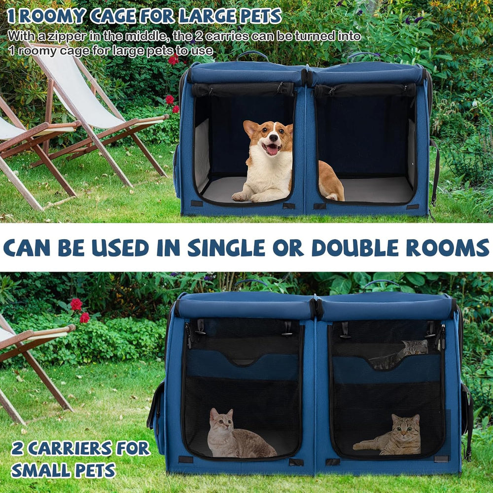 Acerca de este artí [Diseño de Doble artimento]: El transportín para gatos de doble artimento ofrece 2 habitaciones grandes para tus amigos peludos. Ade con una cremallera en el me los 2 artimentos se pueden convertir en un espacio espacioso para que las mascotas grandes lo usen. [Excelente didad]: La malla ventilada garantiza la permeabilidad al aire en el transporte para mascotas y te ayuda a observar a tus mascotas. La cortina enrollable protege la privacidad y evita el viento y la lluvia. Ade el cojín de doble cara presenta un lado suave de felpa y un lado fresco de pp par una didad superior. [Construcción Confiable]: Con tela teñida catiónica de alta resistencia y tela antiaraña la caseta plegable para gatos es duradera para evitar que las mascotas la rasguñen o muerdan. Ade la hebilla de la correa y el cierre de gancho y bucle mejoran la firmeza. [Múltiples usos]: Además de las habitaciones dob el transporte portátil para gatos también viene con hamaca desmontable y caja de arena plegable para satisfacer diferentes demandas. Y proporciona a las mascotas 3 entradas para un fácil acceso. [Transportín Plegable y Portátil]: El transporte grande para gatos de lado suave se puede plegar fácilmente y almacenar en la bolsa de transporte proporcion lo que te permite llevarlo cómodamente a la pl par campame etc. Ade los 4 clavijas de tierra garantizan una fijación firme para un uso confiable. ? Ver más detalles del producto ¿Estás en busca de un transportador de mascotas? Considera esta jaula para gatos de dos artimentos tu opción ideal. Ofrece una versatilidad difícil de superar. El transportador se puede cerrar con cremallera para crear dos habitaciones separa perfectas para mascotas pequeñas. Al abri se convierte en una espaciosa jaula individ adecuada para mascotas más grandes. El transportador está hecho con materiales de alta cali destacando en durabilidad y ofreciendo un ambiente acogedor y bien ventilado para tus mascotas. Para mejorar el paqu se incluye una hamaca para espacio de juego adicio y una caja de arena se encarga de otras necesidades esenciales. El transportador está diseñado para plegarse fácilme haciendo conveniente para llevar a eventos al aire libre. Este transportador promete funcionalidad y didad para tus mascotas. Especificaciones: Color: Marró Negr Azul Marino Material: Ma Tela Teñida de Cat PP, Terciop Oxford Dimensiones del Producto: 40" x 23" x 24 100 cm x 58 cm x 61 cm (L x A x Al) Dimensiones de la Caja de Arena: 16" x 12" x 6.5" 40 cm x 30 cm x 16 cm(L x A x Al) Tamaño del Tapete: 21.5" x 19" 54 cm x 48 cm(L x A) Tamaño de la Bolsa de Transporte: 22” x 22” x 6.5” 56 cm x 56 cm x 16 cm(L x A x Al ) Tamaño de la Hamaca: 16" x 16" x 4" 40 cm x 40 cm x 10 cm(L x A x Al) Peso Neto: 19 lb 9kg Peso Máximo Total: 135 lb 60 kg El paquete incluye: 1 x Transportador de Mascotas 1 x Bolsa de Transporte 1 x Caja de Arena 2 x Hamacas 2 x Tapetes 4 x Estacas 1 x Instrucciones