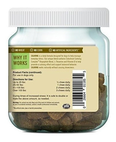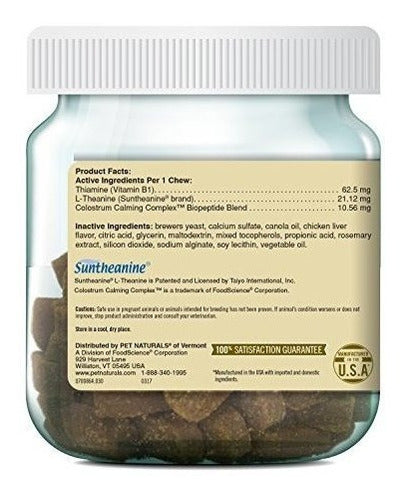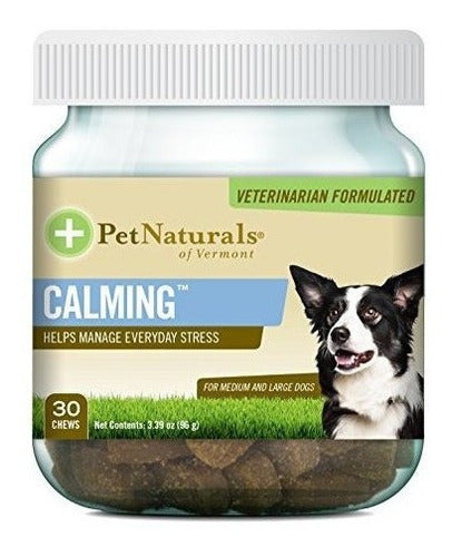 Pet Naturals of Vermont - Calmante, apoyo conductual para perros medianos y grandes-30 masticables suaves Calmante incluye L-Teatina, Calostro Calmante y Tiamina para mantener un estado de calma sin el uso de sedantes. Durante momentos de mayor estrés, es seguro duplicar o triplicar la dosis para lograr el estado de relajación deseado. Los suaves masticables calmantes tienen un delicioso sabor a hígado de pollo que a los perros les encanta El calmante puede comenzar a surtir efecto en tan solo 20 minutos y dura de 4 a 6 horas. Calmar es seguro para uso diario a largo plazo