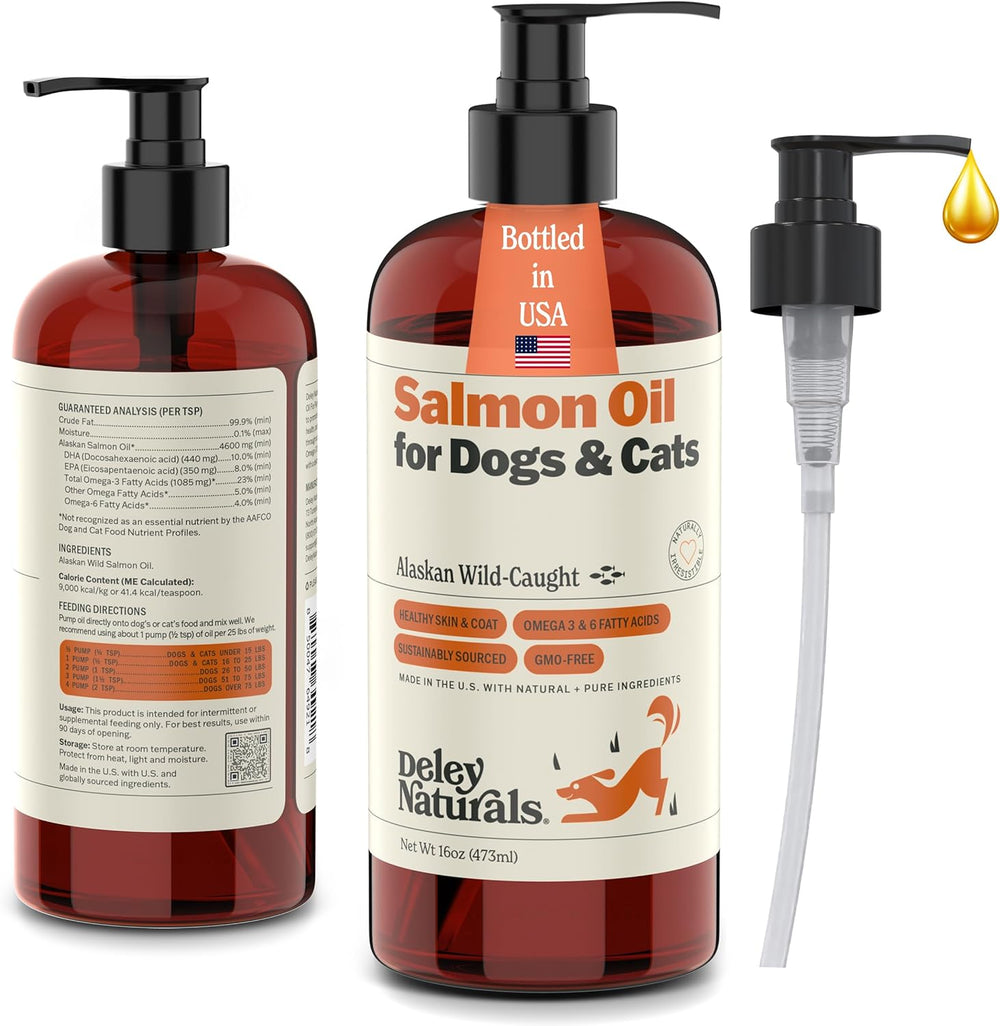 Deley Naturals Aceite de salmón capturado en la naturaleza de Alaska prémium para perros y gatos, suplemento de aceite de pescado rico en omega-3 para una piel, pelaje y articulaciones saludables, totalmente natural, de origen sostenible, 16 onzas