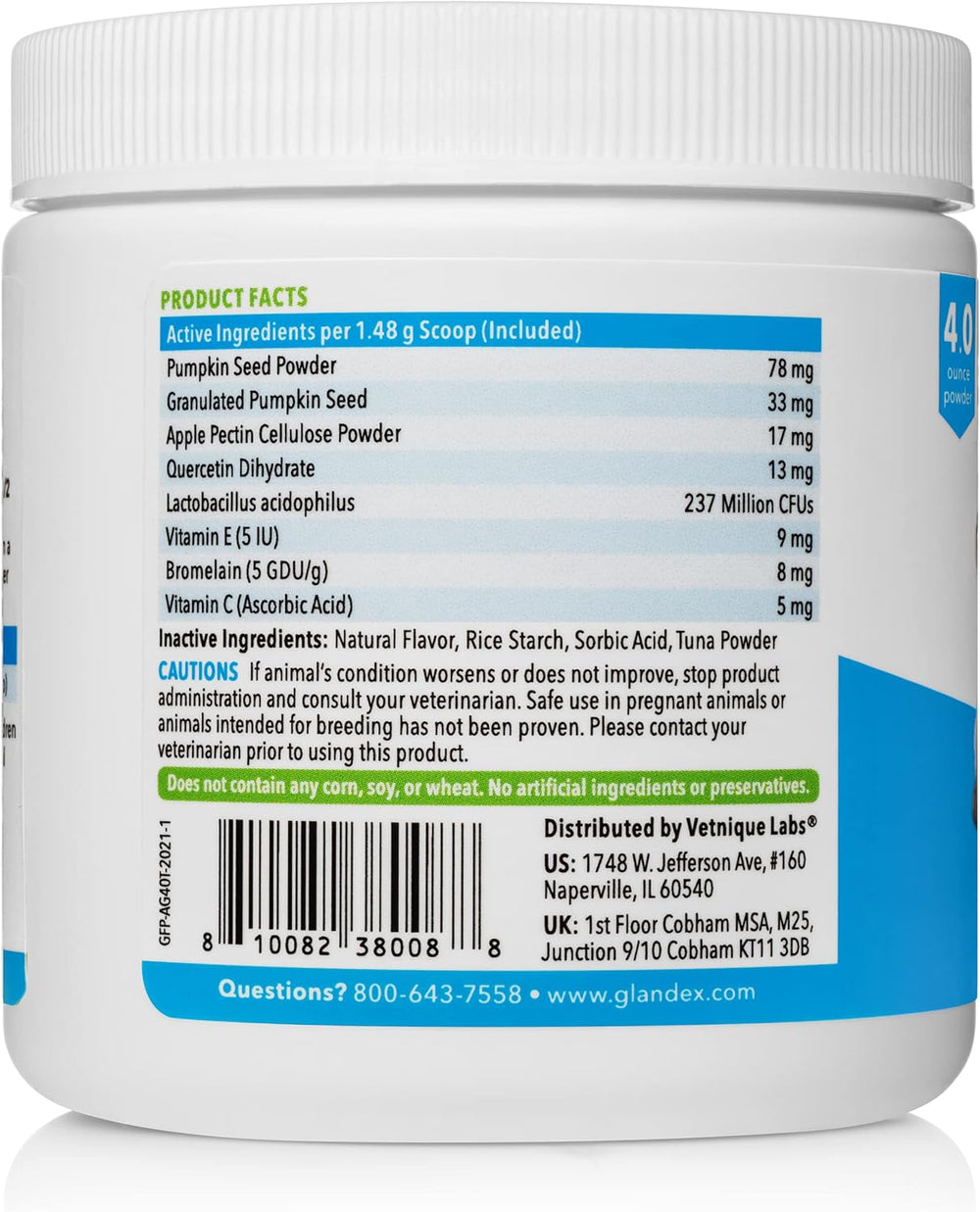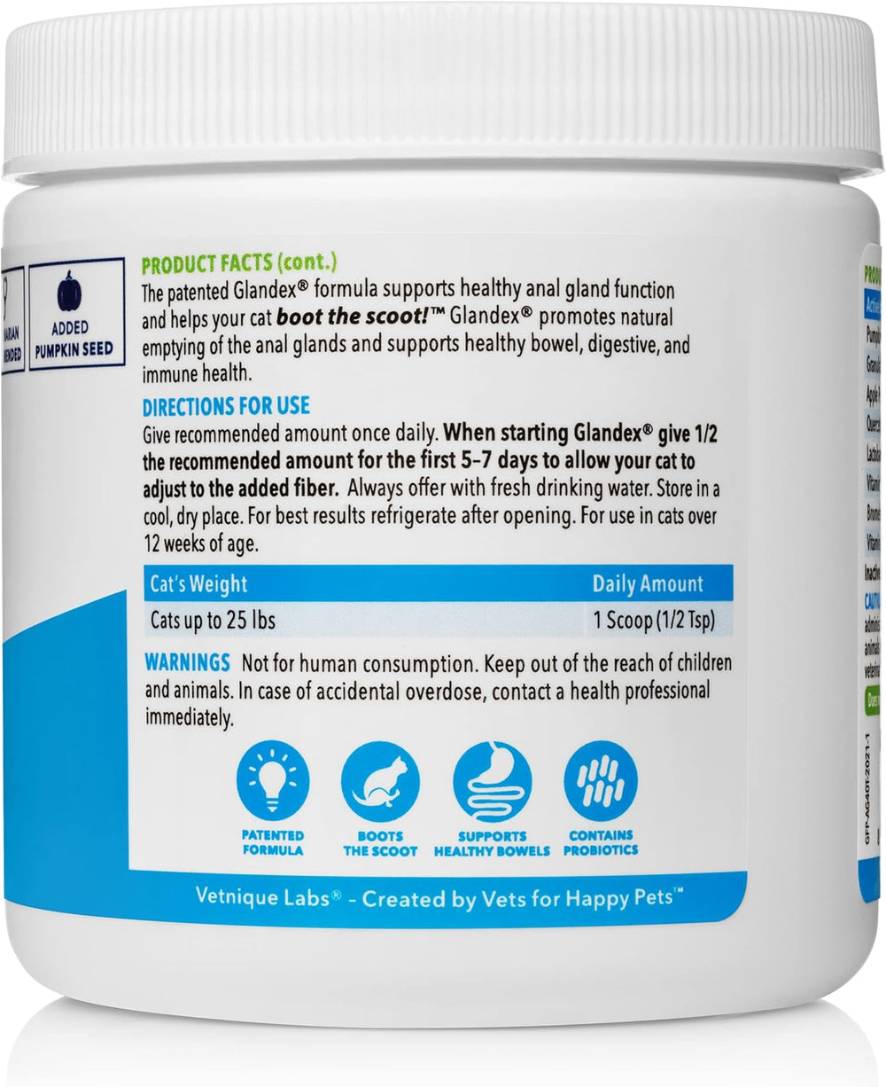 Fórmula específica para gatos: el Glandex está científicamente formulado para apoyar las glándulas anales saludables en los gatos. Con ingredientes cl incluyendo semillas de calab Glandex promueve el vaciado natural de las glándulas anales y apoya la salud digestiva. Fórmula patentada: la fórmula felina patentada de Glandex incluye ingredientes totalmente naturales para mantener las glándulas anales de tu gato saludab incluyendo una mezcla única de fi ácidos grasos om enzimas digesti prebióticos y probióticos para gatos. R ndado por veterinarios: Glandex para gatos es r ndado por miles de veterinarios en todo el mundo y fue desarrollado por veterinarios líderes para apoyar específicamente la función saludable de la glándula anal para darte un gato saludable.