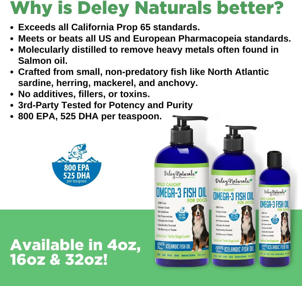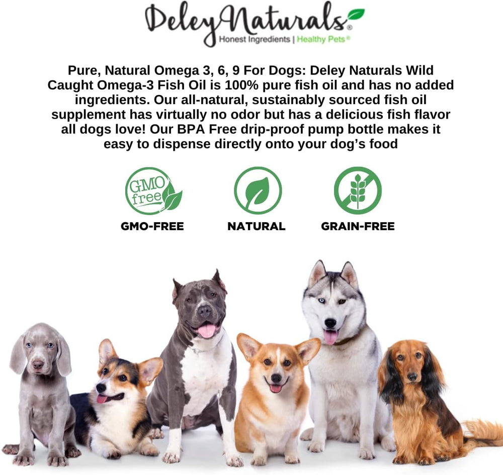 Omeg 6, 9 puro y natural para perros: el aceite de pescado Omega-3 de Deley Naturals es puro aceite de pescado y no tiene ingredientes añadidos. Nuestro suplemento de aceite de pescado natural de origen sostenible prácticamente no tiene o pero tiene un delicioso sabor a pescado que todos los perros aman Nuestra botella de bomba a prueba de goteo sin BPA hace que sea fácil dispensar directamente en la da de tu perro Elimina la picazón en la p el desprendimiento excesivo y las articulaciones dolorosas: Omega 3 6 9 para perros promueve el pelo saludable y brilla alivia la picazón y la piel sensi y alivia las articulaciones dolorosas e inflamadas. Nuestra fórmula libre de OMG también apoya la salud inm la función cardiovascular y mejora la rigidez y las alergias La mejor fuente natural de omega-3: el aceite de pescado omega-3 capturado salvaje con ácidos grasos omega 6 y 9 ofrece niveles más altos de EPA y DHA sin toxinas ni mercurio el aceite de salmón para perros. En lugar de usar peces grandes depredado que a menudo contienen mercurio y otros productos químicos peligro nuestro aceite de pescado está cuidadosamente elaborado a partir de peces pequeños y no depredadores procedentes del frío Atlántico Norte: sard aren caba y anchova Alta cali puro y seguro: nuestro aceite de pescado Omega-3 supera todos los requisitos establecidos por la Proposición 65 de California y todas las normas de farmacopea de Estados Unidos y Europa. El aceite de pescado Omega-3 de Deley Naturals es de grado humano y destilado molecularmente para eliminar todas las toxinas nocivas y metales pesa p sin aditi rellenos o toxinas