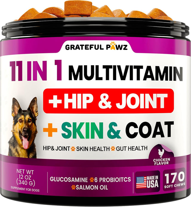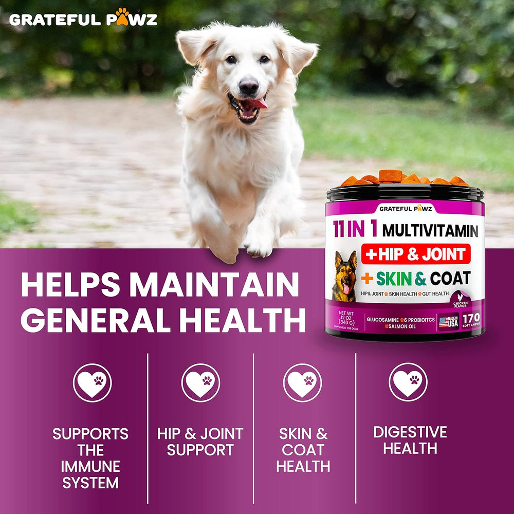 Multivitamina para perros 11 en 1: con una fórmula innovadora basada en 6 probióti aceite de salmón rico en Omeg glucosamina y otras vitaminas y minerales esencia estas vitaminas para perros de raza grande son la elección perfecta para promover el bienestar de tu mascota Apoyo de cadera y articulaciones: el multivitamínico natural de vitaminas para perros Grateful Pawz puede ayudar a reducir la inflamación y la rigidez de las articulacio lo que permite a tu perro disfrutar de una mayor movilidad y flexibilidad aumentando la lubricación. Salud de la piel y el pelo: repletas de ácidos grasos Omega 3 y condroit estas suaves vitaminas para perros mayores pueden ayudar a reducir la pica el enrojecimiento y el exceso de arañazos o la manteniendo el pelaje de tu perro brillante y fuerte 10 8 5 Intestino y digestión: con inulina prebiótica y 6 cepas prebióticas que tienen 300 millones d estas vitaminas prenatales para perros pueden apoyar la salud intestinal y digest disfrutando de la máxima biodisponibilidad y un sistema rápido de suministro de nutrientes. Perros peque medianos y grandes Golosina favorita para todos los días: los suplementos y vitaminas para perros Grateful Pawz tienen una textura masticable ultrasuave y un delicioso sabor natural de po ideal incluso para los dores más exigentes Una excelente opción para perros de todas las razas y tamaños