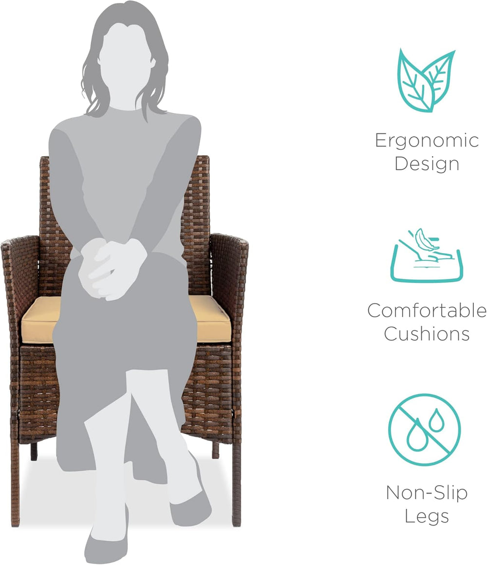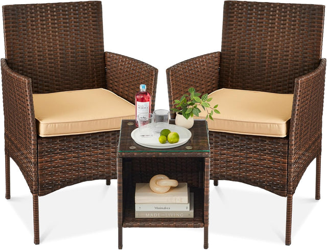 Best Choice Products Juego de 3 piezas de mimbre para exteriores, muebles de patio que ahorran espacio para patio, jardín con 2 sillas, 2 cojines, mesa de almacenamiento lateral, color marrón/bronceado