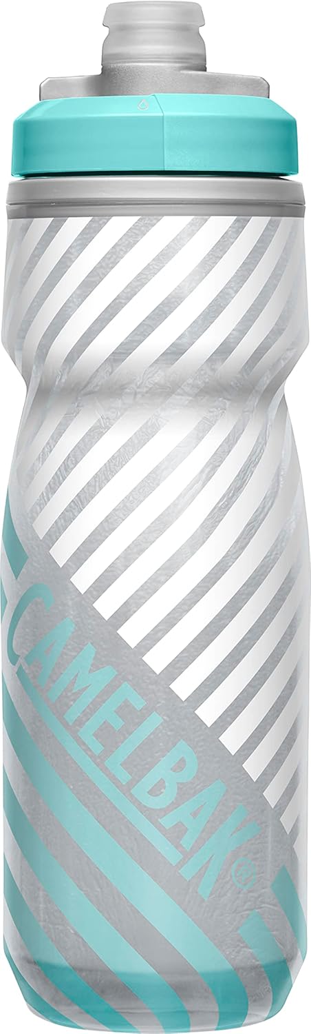 CamelBak Podium Chill Botella de agua aislada para bicicleta, botella fácil de apretar, se adapta a la mayoría de jaulas de bicicleta, 21 onzas, rayas gris/verde azulado