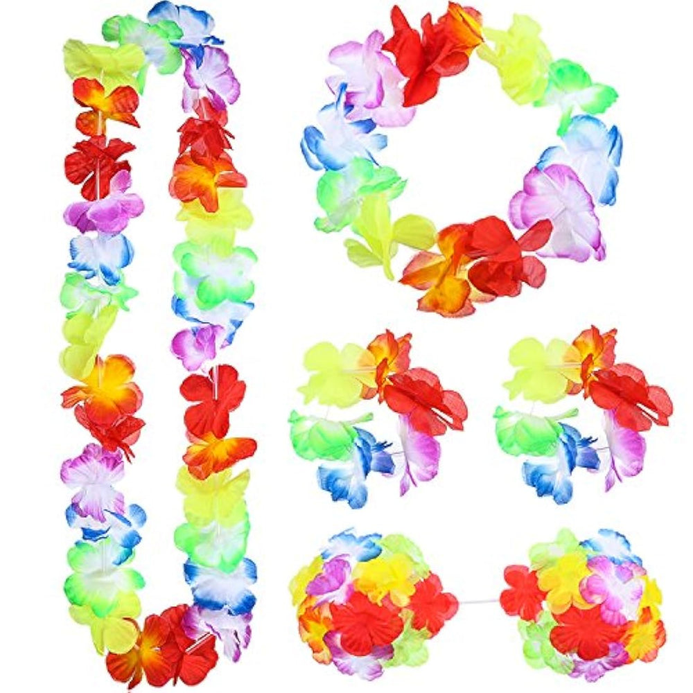 El paquete de 8 piezas incluye: 1 falda de hula de cés 1 collar de flores de l 1 diadema elástica de flo 1 par de pulseras elásticas de flores de l 1 par de parte superior de bikini de flo 1 par de gafas de sol de p 1 clip de pelo con flor de hibisco