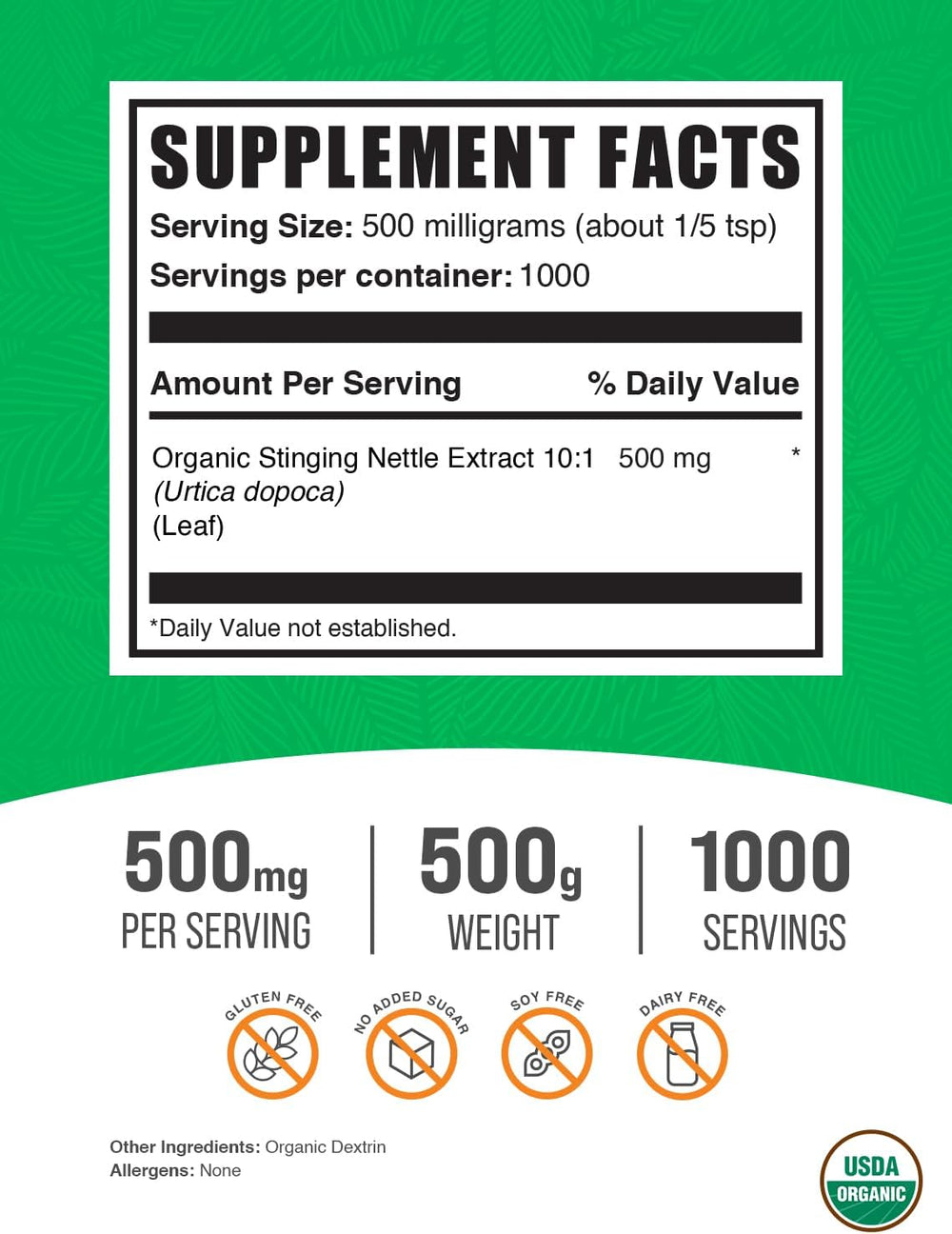 Extracto Orgánico de Ortiga - BulkSupplements, 500mg, 500g