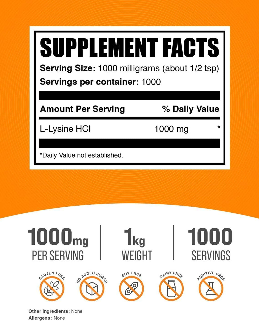 L-Lisina en polvo BulkSupplements, 1000mg, 1kg, Inmunidad