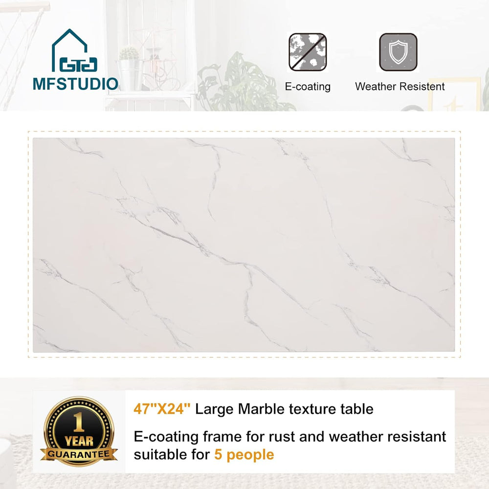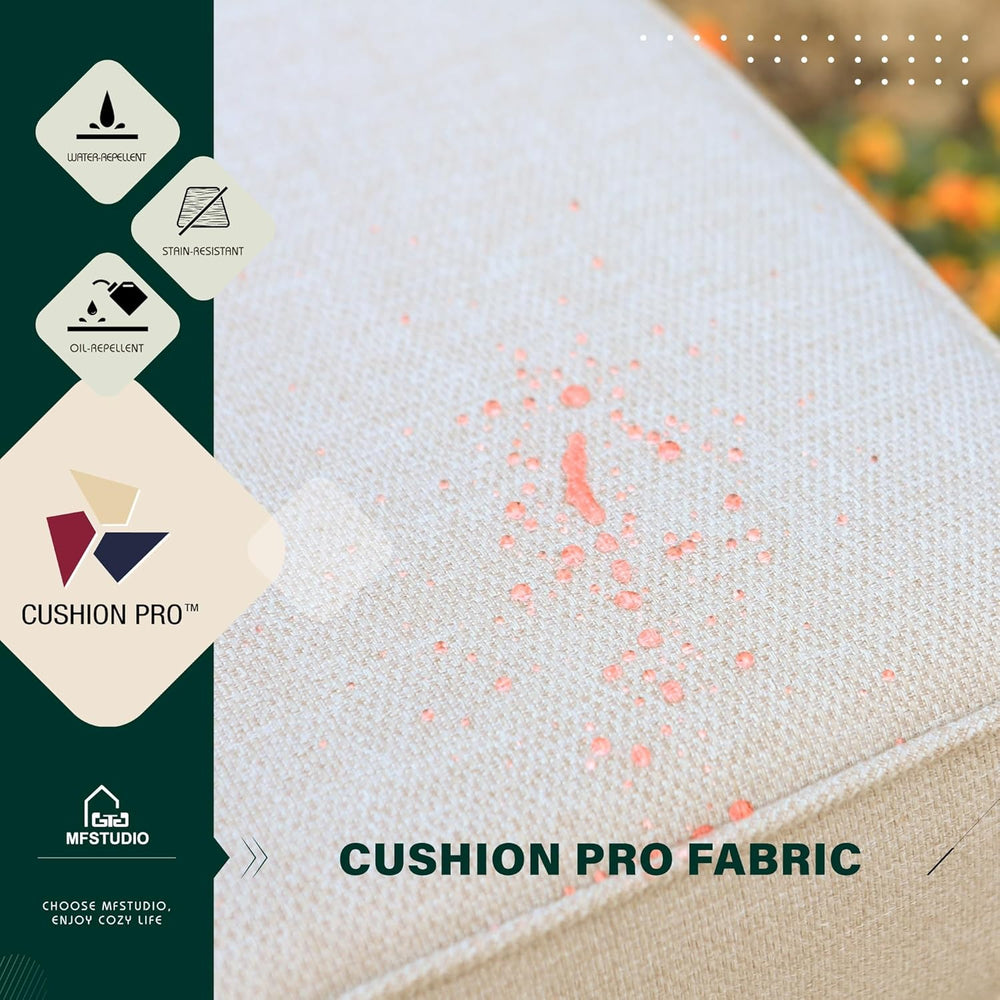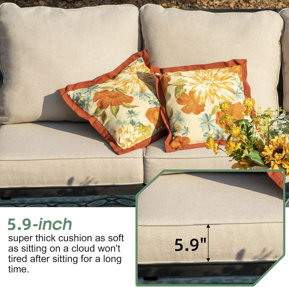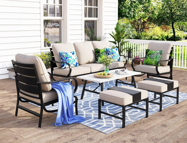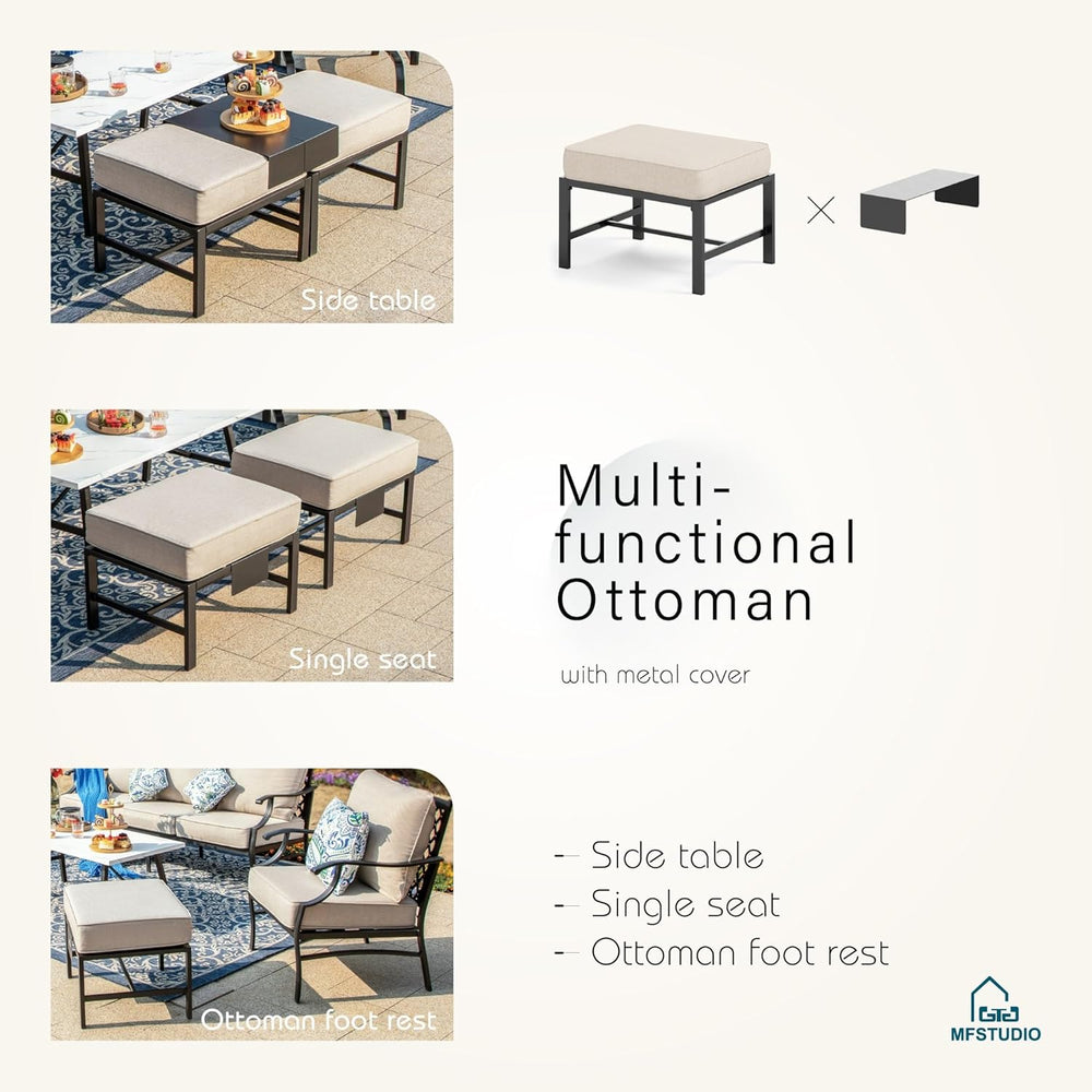 MFSTUDIO Juego de 6 piezas de conversación de patio (7 asientos), sofás de muebles de metal para exteriores con 1 sofá de 3 asientos, 2 sillas individuales, 2 otomanas y 1 mesa auxiliar, marco de hierro forjado con cojín beige