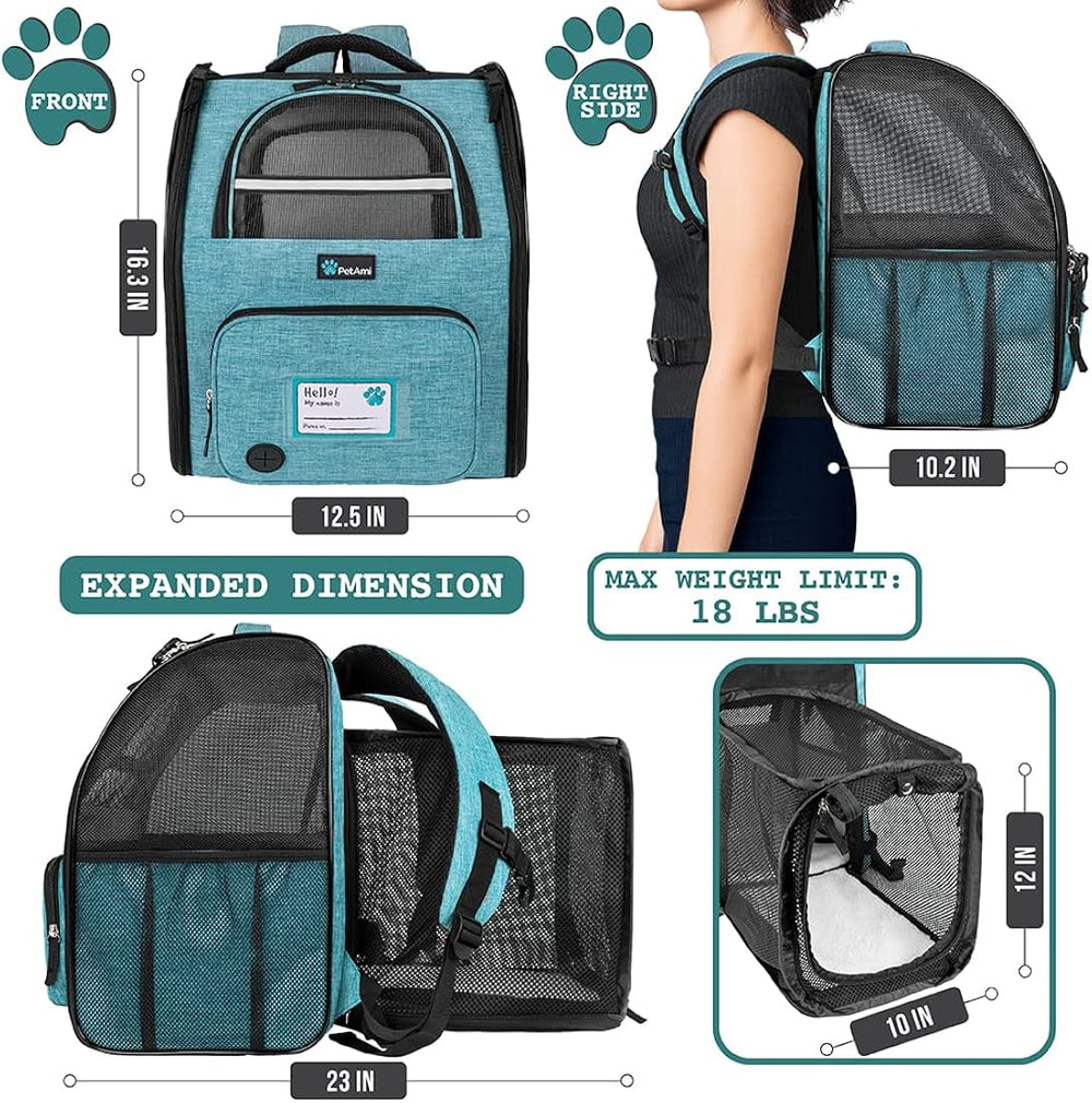 Mochila extensible para mascotas: esta mochila transportadora aprobada por aerolíneas es perfecta para perros pequeños o medianos y gatos grandes. Diseñado para la máxima didad y didad mientras haces senderismo y viajas. Cómodo y transpirable: diseño bien ventilado para un flujo de aire ópt entrada de tres vías para un fácil acc ventana de malla con cremallera para más espacio y visibili y ropa de cama gruesa y acogedora con forro sherpa para que tu mascota pueda descansar y relajarse. Esta mochila transportadora está firmemente estructur proporcionando un amplio espacio para que tu mascota se mueva. Diseño seguro y seguro: fabricado con poliéster 600D duradero de alta calidad para una experiencia duradera. Equipado con una estructura firmemente reforzada para evitar que se colapse en tu mascota mientras viajas. También viene con una correa de seguridad y hebilla en el interior para asegurar a tu mascota y evitar escapes. Funcional y práctico: viene con dispensador de bolsas para excremen un bolsillo frontal y dos bolsillos laterales de malla para almacenar suministros esenciales para mascotas. Las correas de espalda y hombro están equipadas con acolchado extra grueso para mayor didad durante viajes largos. Hebillas de cintura y pecho para darte apoyo adicional. Ideal para mascotas pequeñas y medianas: mide aproximadamente 12.5 x 10.2 x 16.3 pulgadas (largo x ancho x al límite de peso de hasta 18 libras. Se adapta a la mayoría de per ga cachor gatitos y mascotas. Antes de mide a tu mascota. Longitud: cuello a base de la cola. Altura: del suelo a la parte superior del hombro.
