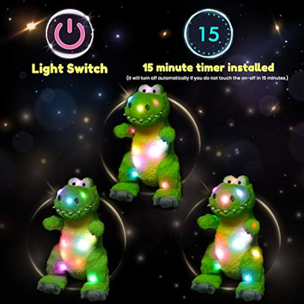 Materiales de alta calidad y mano de obra fina: el dinosaurio de peluche está hecho de tela supersuave que es muy cómoda y suave al tacto. Seguro y suave para que los niños lo abrazen. Los ojos del juguete en el dinosaurio de peluche están firmemente cosidos, y utilizamos la cinta de velcro en la parte posterior del dinosaurio, en caso de que la cremallera tradicional pueda dañar a los niños. Cómo jugar: los adultos deben abrir el velcro en la parte posterior del dinosaurio, y luego abrir la caja de la batería con un destornillador. Pon 3 pilas AAA (no incluidas) y gira el interruptor a "ON". Pulsa el botón del interruptor, funcionará. Por lo tanto, los niños pueden jugar con el dinosaurio y compartirlo con amigos. Aviso: mantenlo alejado del agua y del fuego. Compañero creativo para niños: equipado con coloridas luces LED en el interior, este acogedor dinosaurio brillará en la oscuridad cuando se enciende y te confortará. También ayuda a los niños y adultos a relajarse tomar una siesta en la tarde o acompaña a aquellos que tienen miedo de la oscuridad durante la hora de acostarse, lo que ayudará a reducir la ansiedad y les ayudará a calmarse para una mejor relajación, por lo que no es solo un juguete. Luces cambiantes de colores y apagado automático: este dinosaurio de peluche brilla en la oscuridad y la luz cambiará varios colores cada pocos segundos. Además, hemos instalado un temporizador de 15 minutos en el interior que se apagará automáticamente si no tocas el encendido y apagado en 15 minutos. Mientras tanto, puedes apagarlo como quieras pulsando el interruptor de nuevo. Consideraciones: no lavar y mantener alejado del fuego. Requiere 3 pilas AAA, pero las pilas no están incluidas. Retira la batería, si no la utilizas durante mucho tiempo.
