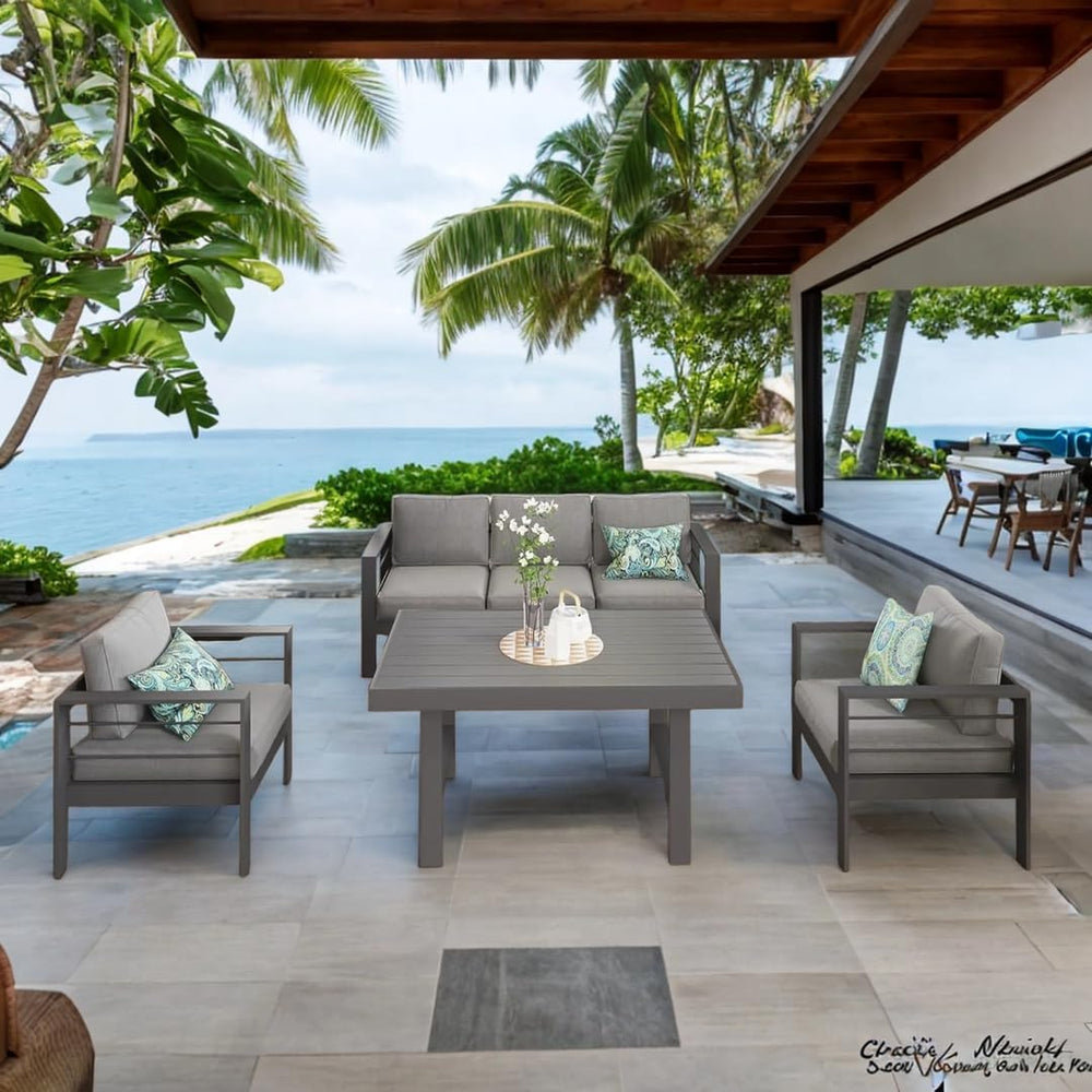 Solaste Juego de muebles de aluminio para patio, 4 piezas, moderno juego de conversación al aire libre, sofá con cojín mejorado y mesa de comedor, color blanco está agotado y se enviará tan pronto como vuelva a estar disponible.