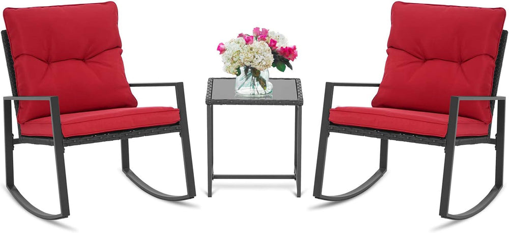 SUNCROWN Juego de 3 piezas de bistró mecedora para exteriores, muebles de mimbre negro, sillas de porche, juegos de conversación con mesa de café de cristal, color rojo está agotado y se enviará tan pronto como vuelva a estar disponible.