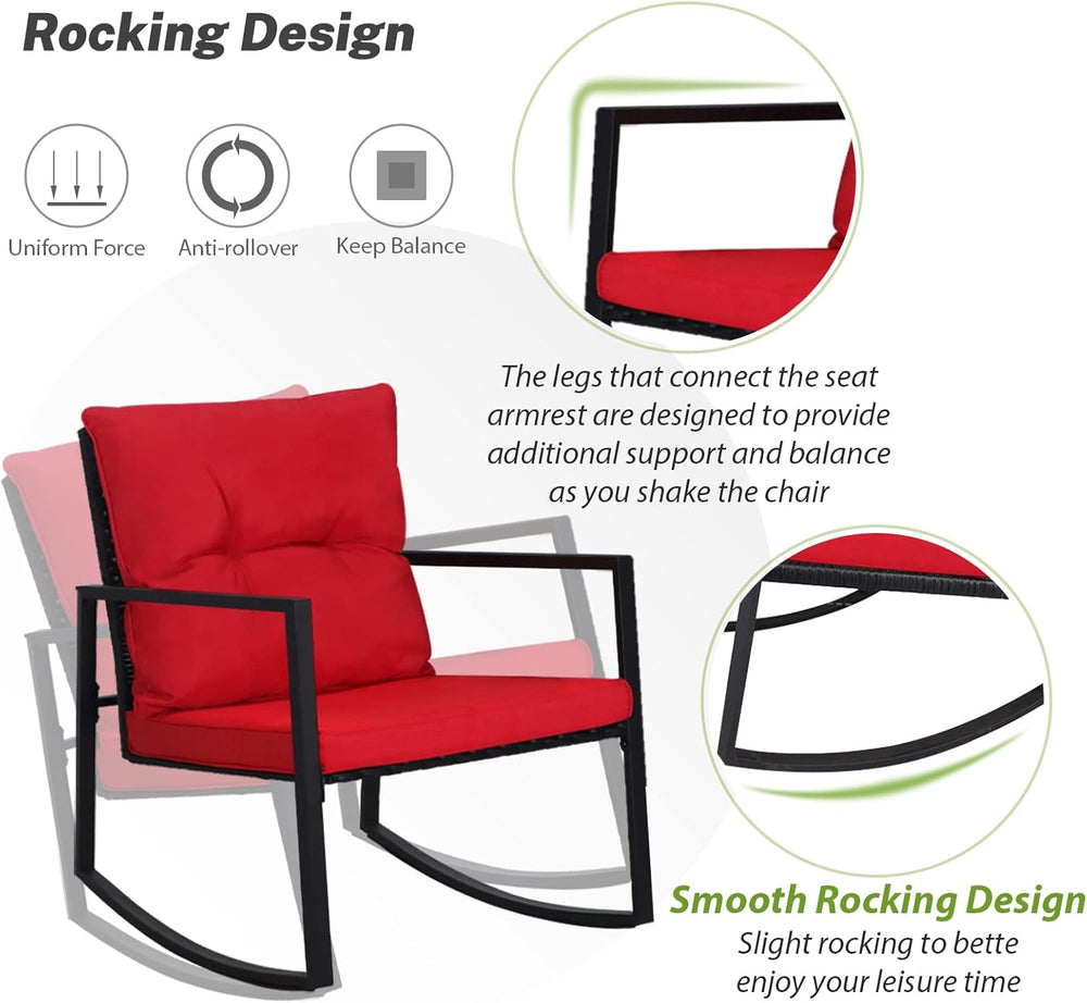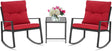 SUNCROWN Juego de 3 piezas de bistró mecedora para exteriores, muebles de mimbre negro, sillas de porche, juegos de conversación con mesa de café de cristal, color rojo
